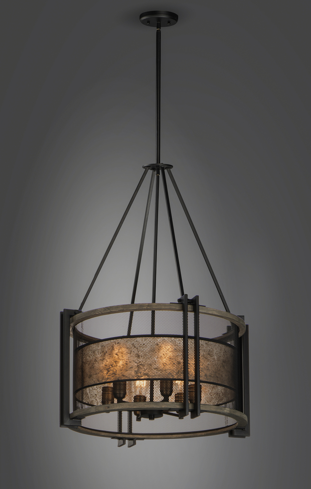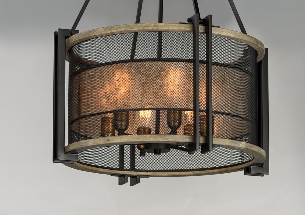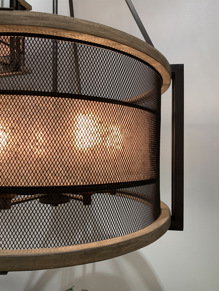 Frames of wood finished in Barn Wood and cradled by Black metal brackets were used to create this beautiful rustic design. The Black mesh screen is accented with a band of mica and Antique Brass sockets to deliver rustic charm with all the right fixings.