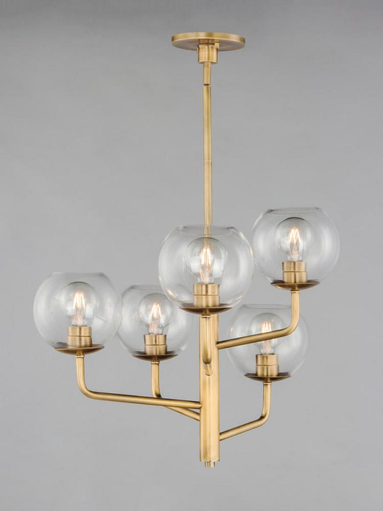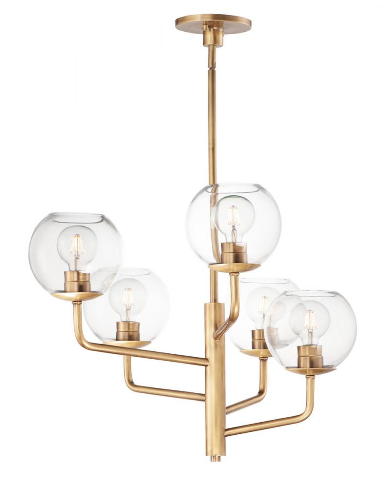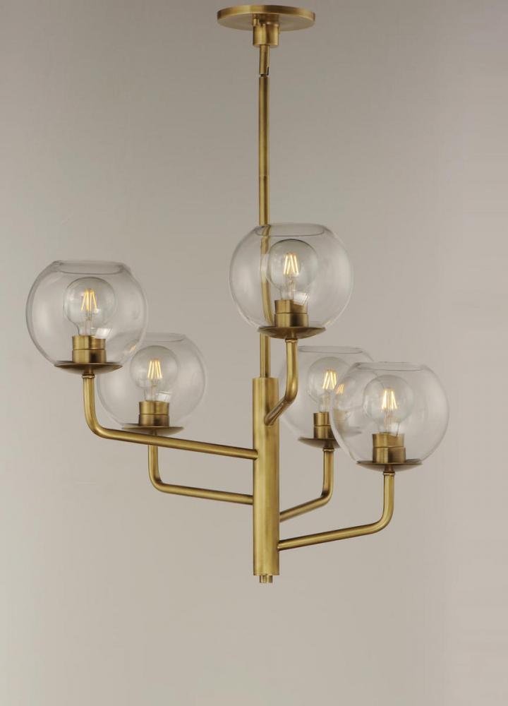 Vessels of heavy weight Clear glass are supported on frames of solid brass finished in a hand rubbed Natural Aged Brass finish. A versatile collection of up and down configurations which can be directly attached to the canopy or extended down by the rods supplied.