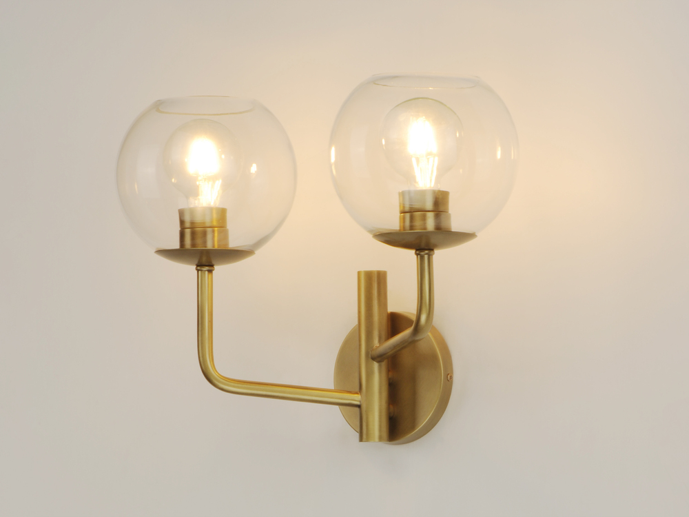 Vessels of heavy weight Clear glass are supported on frames of solid brass finished in a hand rubbed Natural Aged Brass finish. A versatile collection of up and down configurations which can be directly attached to the canopy or extended down by the rods s