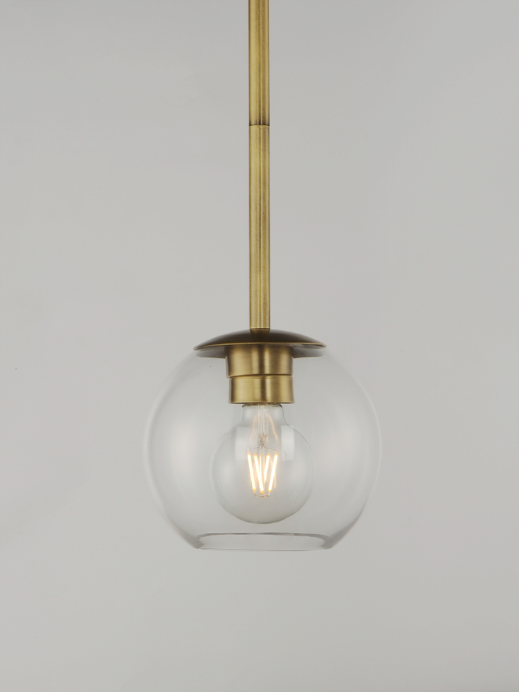 Vessels of heavy weight Clear glass are supported on frames of solid brass finished in a hand rubbed Natural Aged Brass finish. A versatile collection of up and down configurations which can be directly attached to the canopy or extended down by the rods s