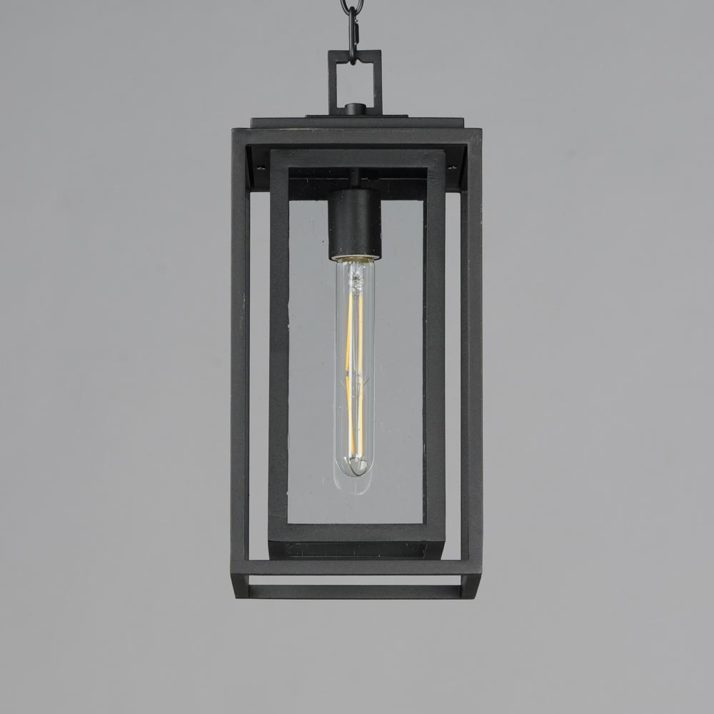 A dual framed structure creates dimension on these outdoor lighting fixtures that is both contemporary and transitional. The construction consists of two frames of square tubing and squared components. The inner frame's Clear Seedy glass reduces gla