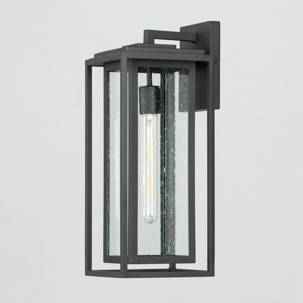 A dual framed structure creates dimension on these outdoor lighting fixtures that is both contemporary and transitional. The construction consists of two frames of square tubing and squared components. The inner frame's Clear Seedy glass reduces gla