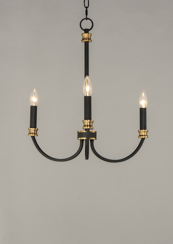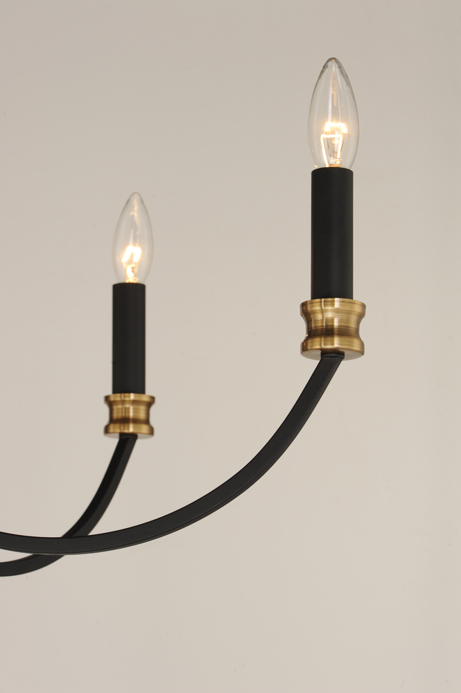 A lovely candelabra style collection with rich accents. This seemingly simple chandelier highlights classically curving accents in a stately combination of Black with Antique Brass accents or chic Weathered White with Gold Leaf accents. Taking a streamline