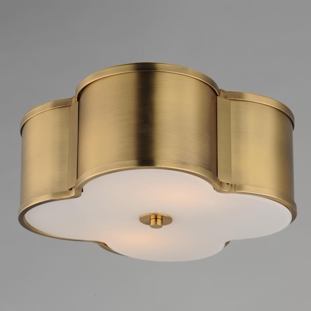 Honoring the traditional scalloped shade design in a range of materials, flush mounts are available in your choice of fabric, metal, or glass shades. The fabric shade features an Off-White linen fabric and is accented with Aged Brass metalwork. In the glas