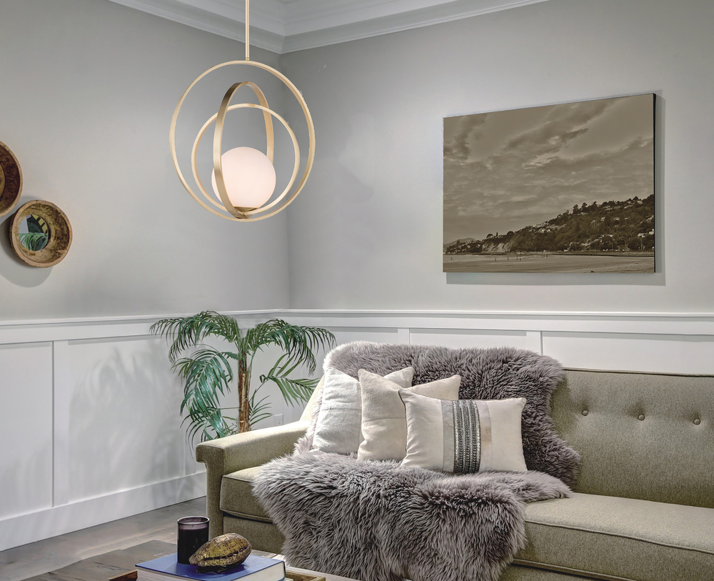 Adjustable rings available in Polished Chrome or Satin Brass add dimension to this contemporary pendant design. Opal white glass softly diffuses light to complete the look.