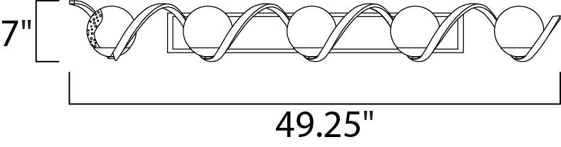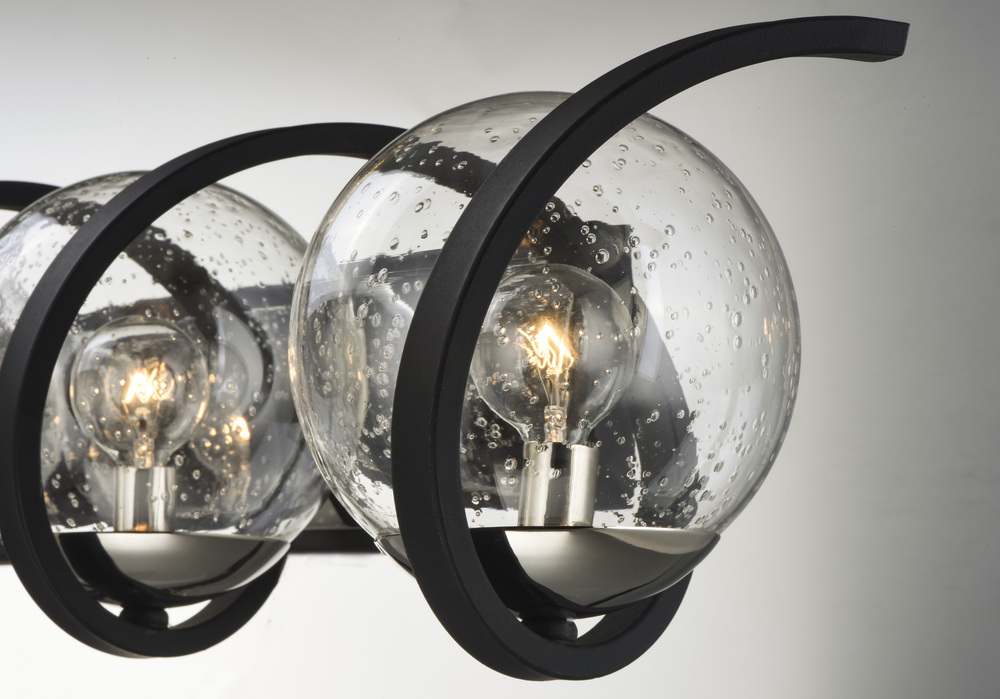 Rectangular metal channel, finished in Black, is meticulously formed in a curl design to create a unique and dramatic design. Clear Seedy glass balls supported by cups of Polished Nickel are strategically positioned to balance out the design.