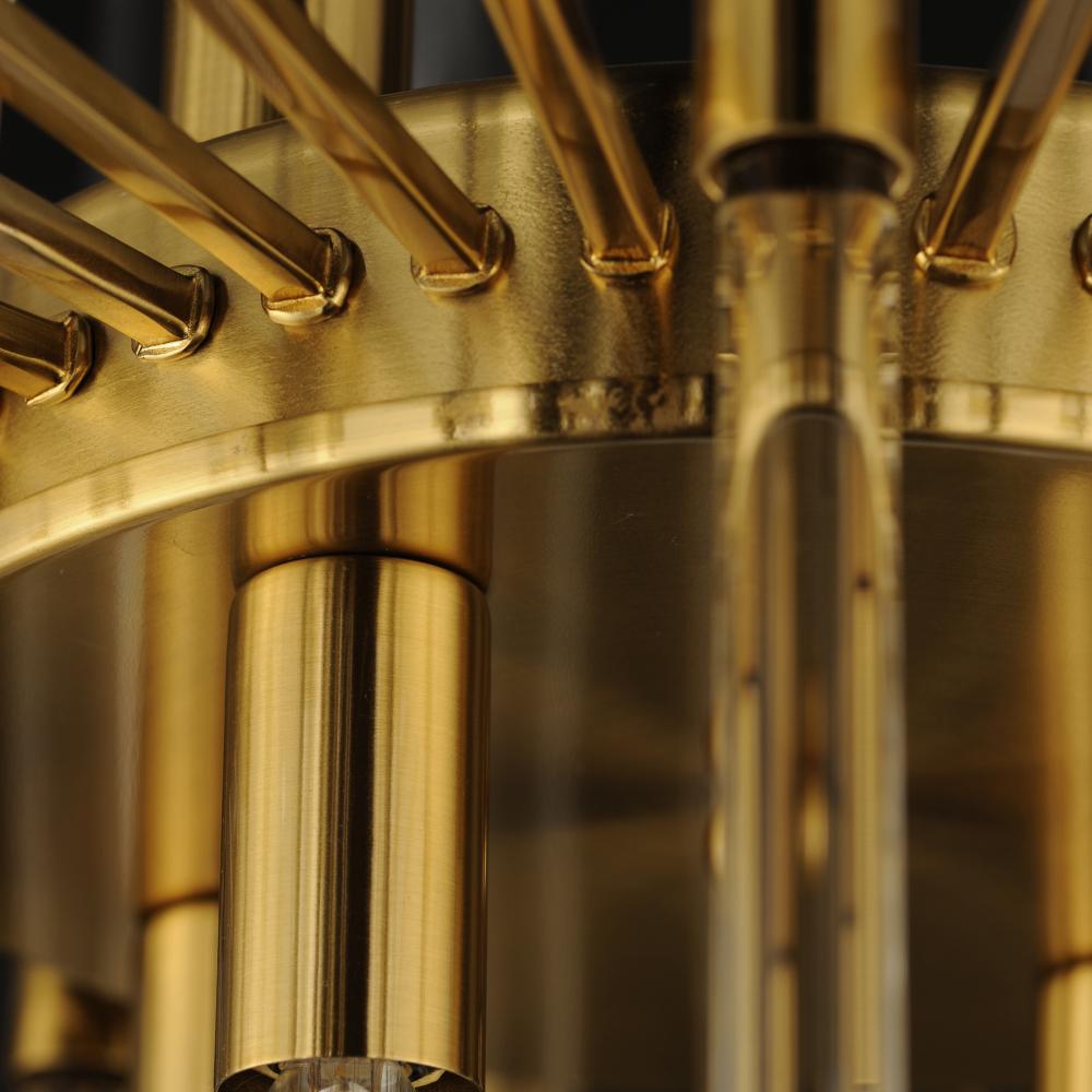 The composition of Clear glass rods are elegantly supported by thin radial arms of staggered lengths to create an iridescent motif that is truly Divine. Finished in Polished Nickel or Heritage Brass, the simplicity of this design delivers a crisp lighting