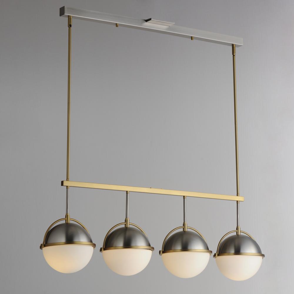 Tasteful globes constructed of metal and glass halves are combined and suspended by an arc-shaped yoke structure. The top dome of robust steel support lower halves of Satin White glass shades that twist lock on for convenience of installation and maintenan