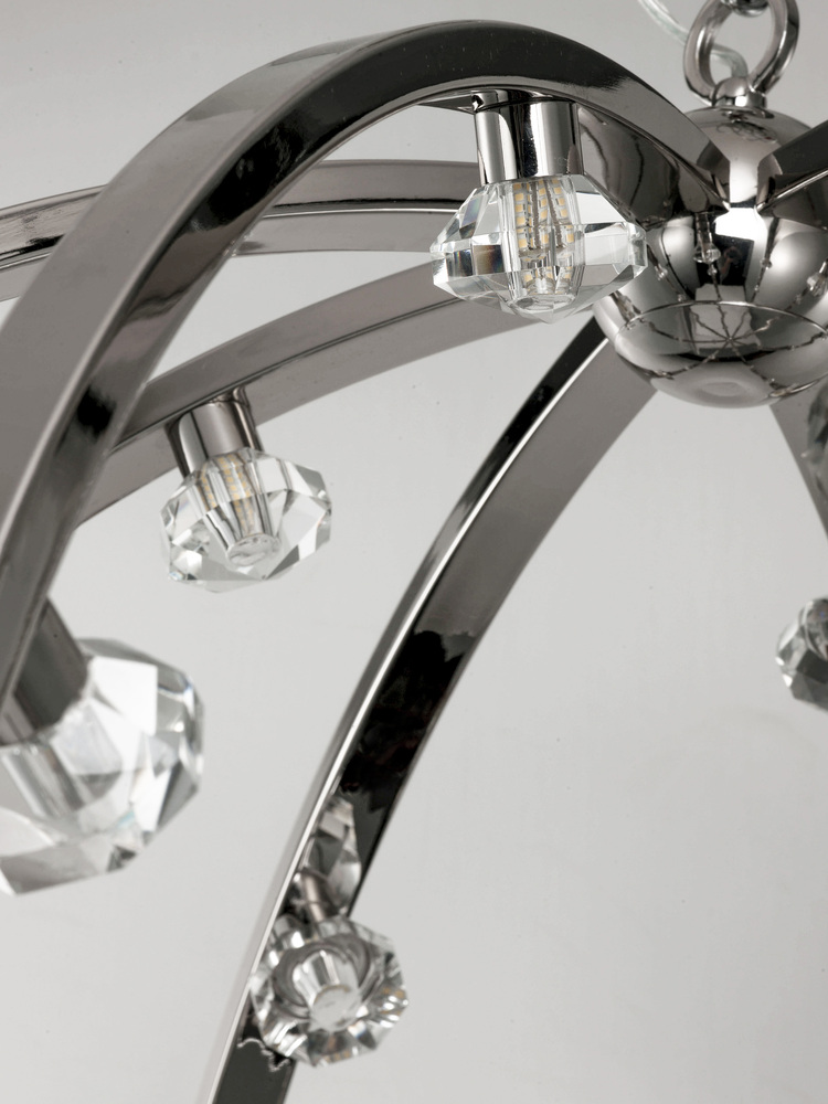 Bands of steel finished in Polished Nickle or Textured Black with Polished Nickle accents, create spherical forms of lighting. These spheres are graced with Beveled Crystal fonts which conceal dimmable LED bulbs. A perfect blend of grace, beauty and ener