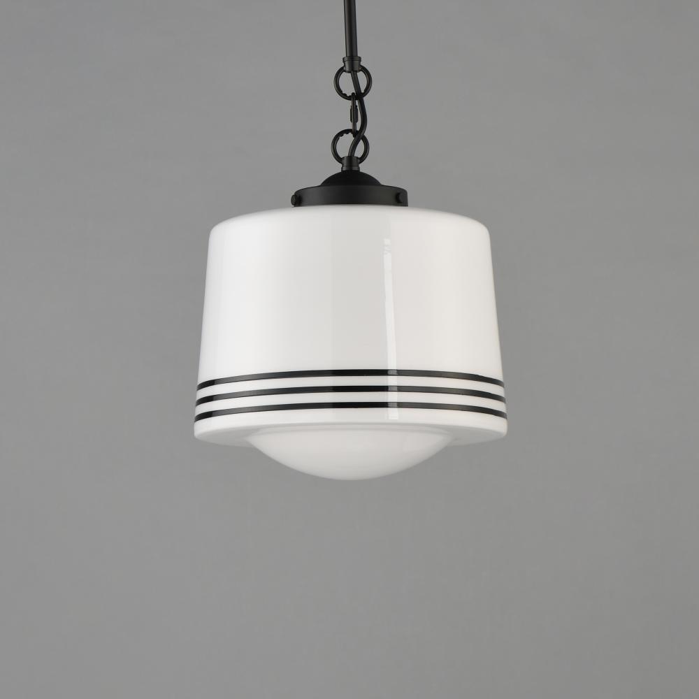A refreshed take on classic schoolhouse glass pendants, this collection combines nostalgia with modern flair. The opal white glass shades feature repeating black stripes for a contemporary twist, while Matte Black tops and streamlined down rods add a clean
