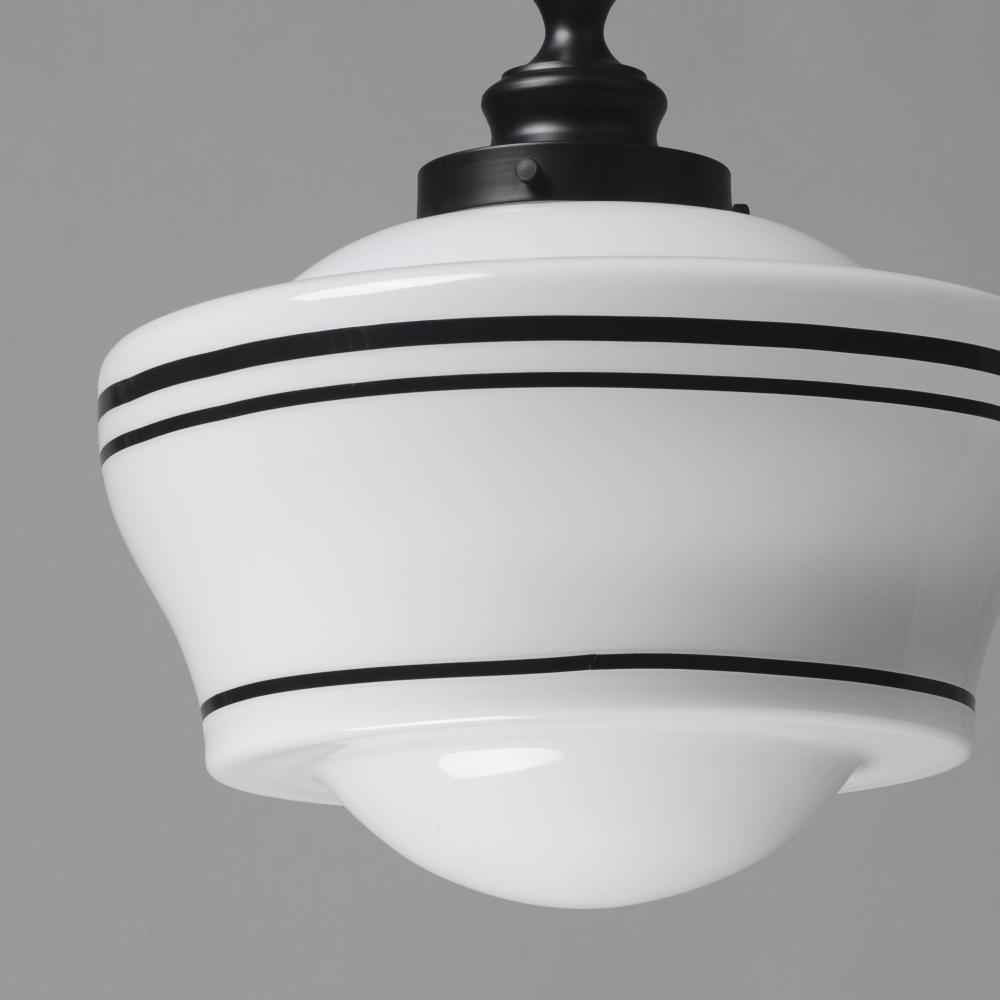 A refreshed take on classic schoolhouse glass pendants, this collection combines nostalgia with modern flair. The opal white glass shades feature repeating black stripes for a contemporary twist, while Matte Black tops and streamlined down rods add a clean