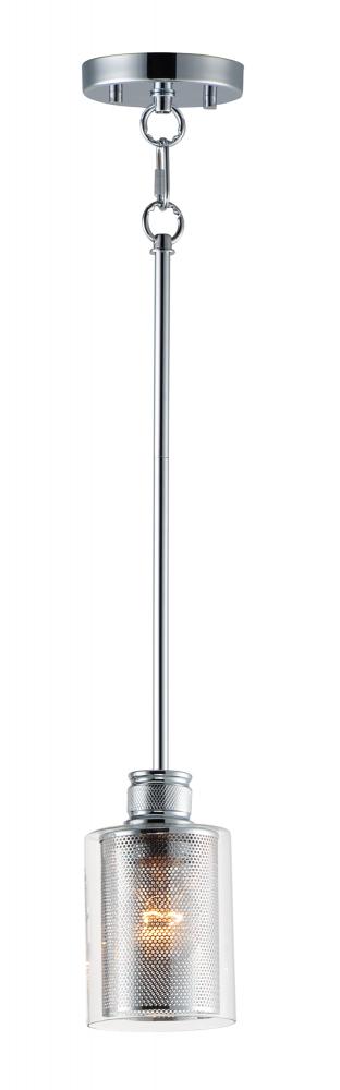 Clear glass cylinders lined with mesh screen are supported by knurled cups of Polished Chrome creates a contemporary design with an industrial twist. This economical collection provides a designer