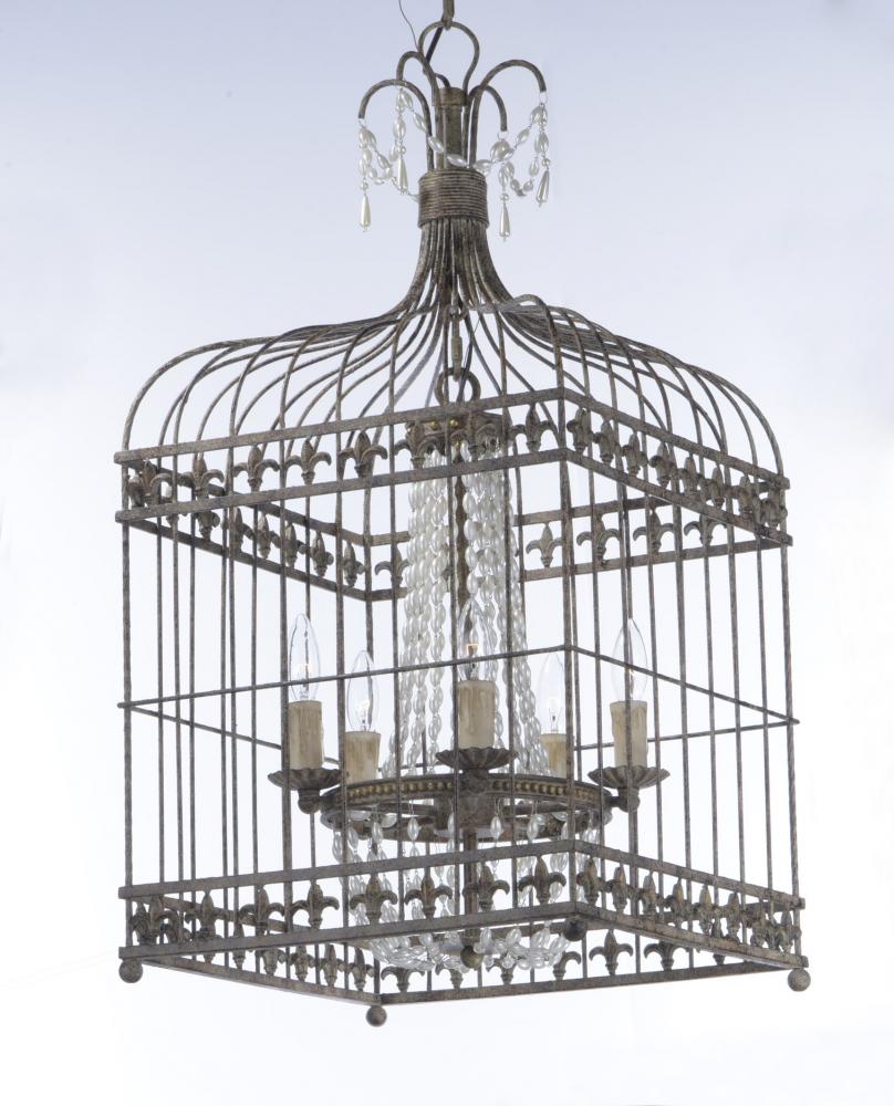Elegant chandeliers draped in strands of lustrous pearl like beads are housed in French provincial cages that are finished in Antique Terra for a realistic antique appearance. Also available are some of the chandeliers without the cage. The unique piece