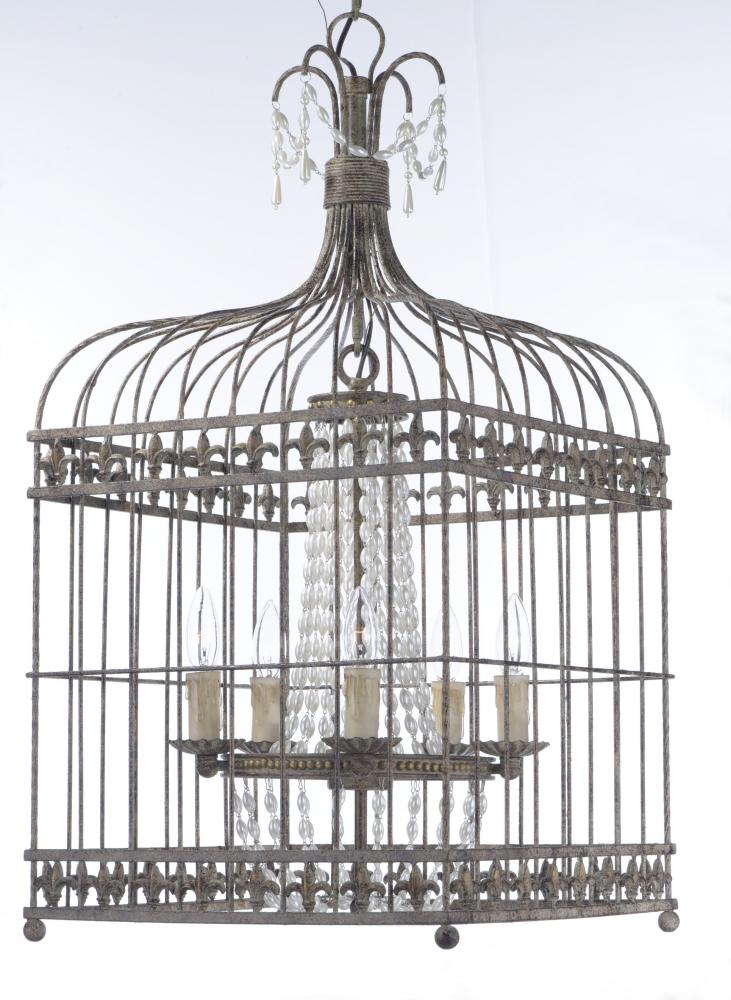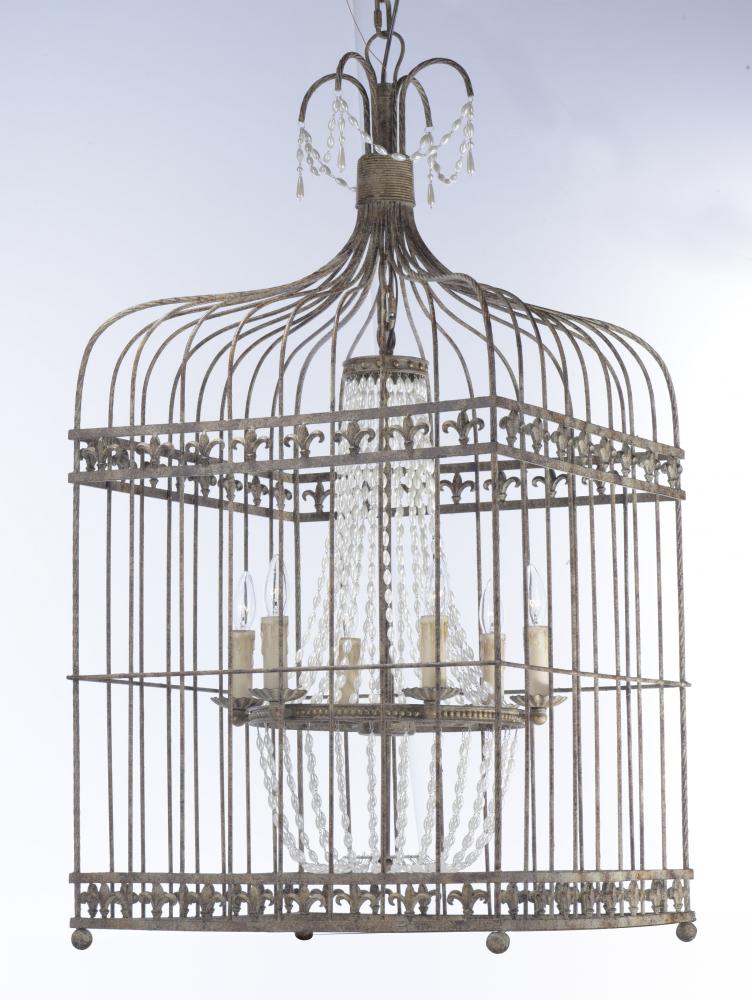 Elegant chandeliers draped in strands of lustrous pearl like beads are housed in French provincial cages that are finished in Antique Terra for a realistic antique appearance. Also available are some of the chandeliers without the cage. The unique piece