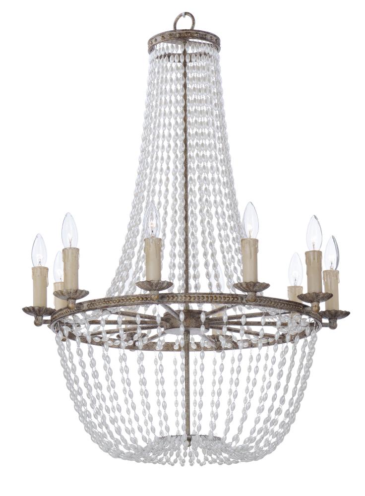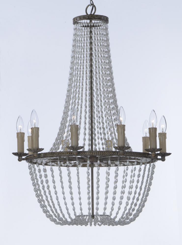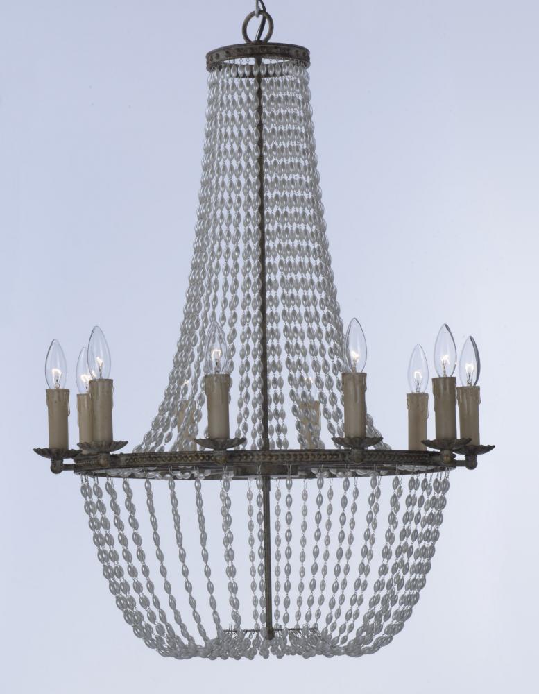 Elegant chandeliers draped in strands of lustrous pearl like beads are housed in French provincial cages that are finished in Antique Terra for a realistic antique appearance. Also available are some of the chandeliers without the cage. The unique piece