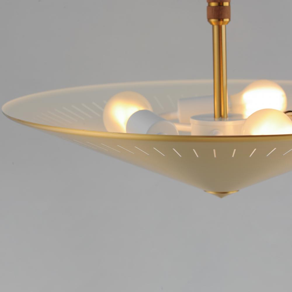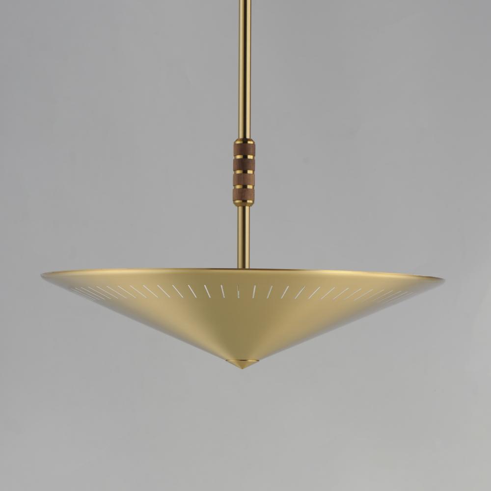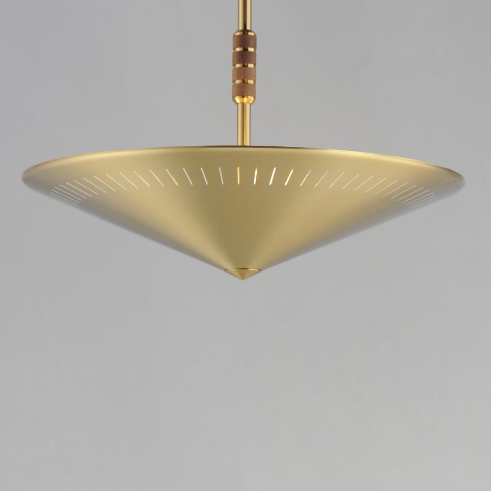 A retro re-imagining of perforated brass shades, this collection is inspired by Scandanavian Mid-Century Modern design. The conical forms feature cut outs along the edge of the shade allowing light to illuminate downward in a spectacular lighting effect. O