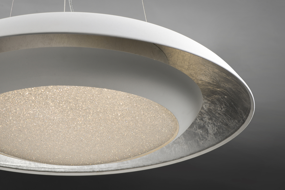 Domes of metal house a circular light engine housing with a Crystaline diffuser. A dramatic lighting effect is created with in-direct light highlighting the foil lining while direct light shines through the sparkling center. Available in your choice of Whi