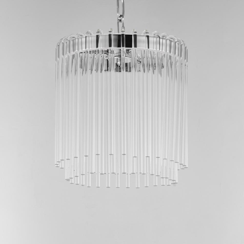 Clear glass rods elegantly curve to drape over a metal frame, encasing an integrated LED light source within. These ornamental glass rods form a luminous curtain, softly illuminated by the LEDs. The LED light source features an adjustable color temperature