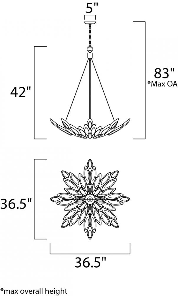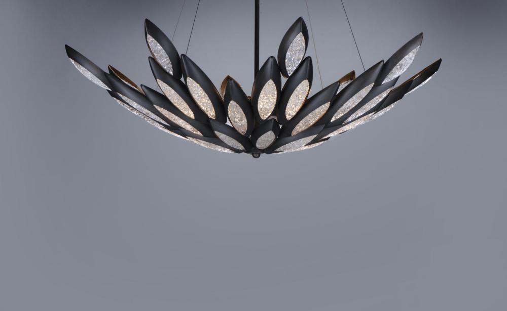 Formed metal leaves finished in Burnished Bronze with insets of clear Ice glass shimmer when illuminated by powerful Xenon lamps. This soft contemporary design can be at home in a wide variety of room decor.