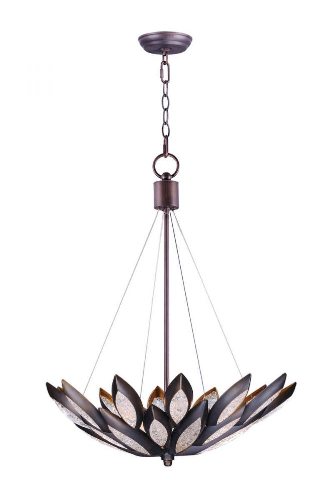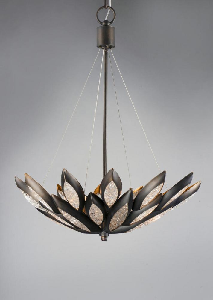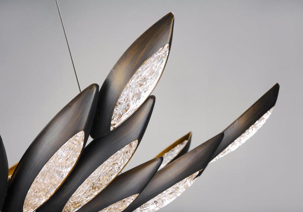 Formed metal leaves finished in Burnished Bronze with insets of clear Ice glass shimmer when illuminated by powerful Xenon lamps. This soft contemporary design can be at home in a wide variety of room decor.