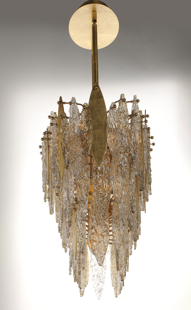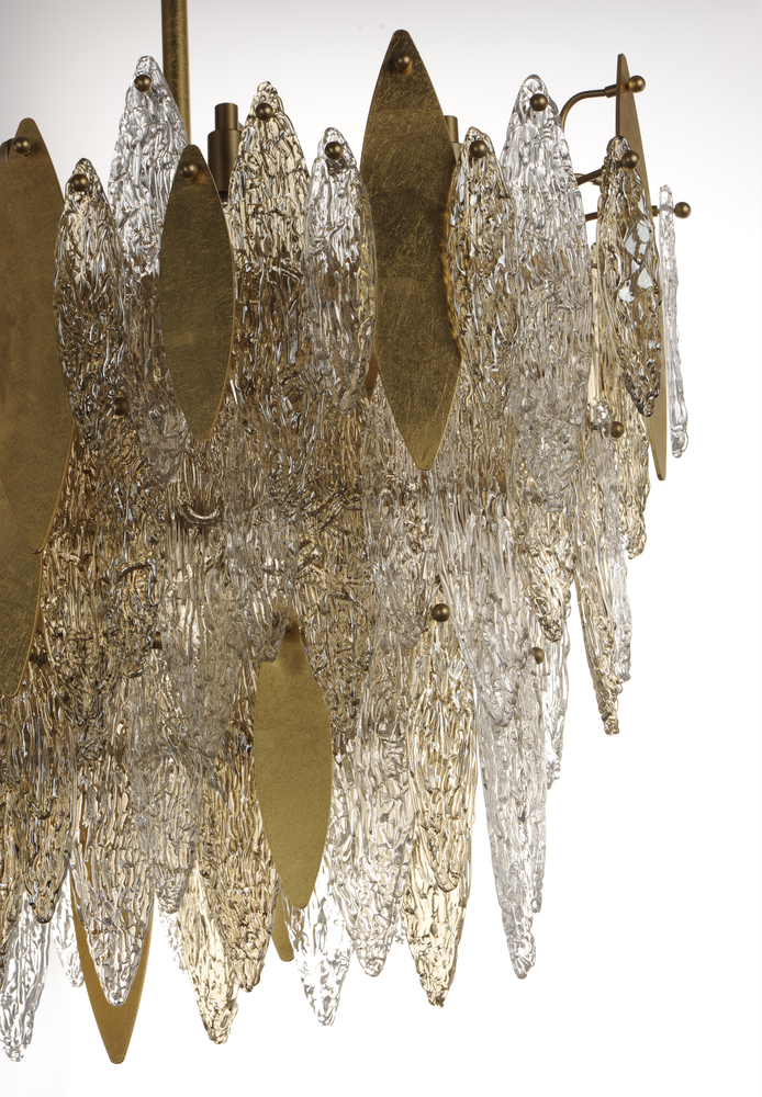 Hand-formed glass petals of Clear and Champagne-tint suspend from a tiered frame of gold and accented with petals of solid metal finished in Gold Leaf. Numerous candelabra sockets are strategically placed within the fixture to create glimmer and elegance t