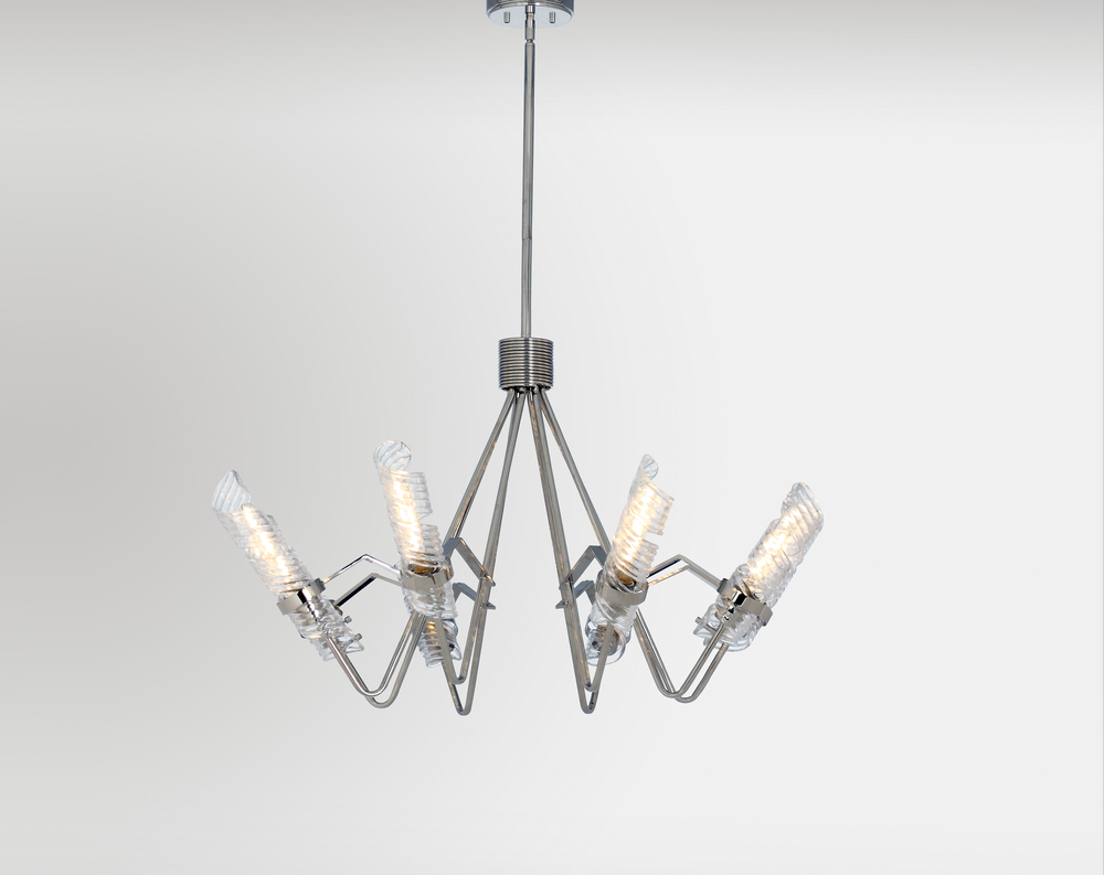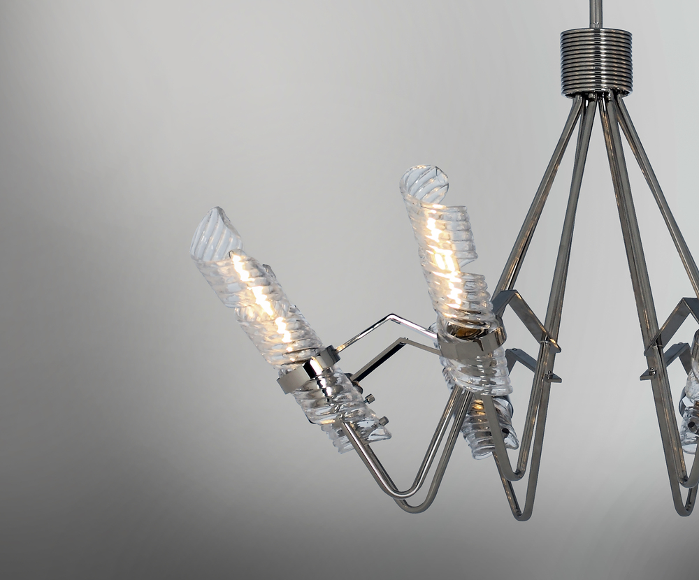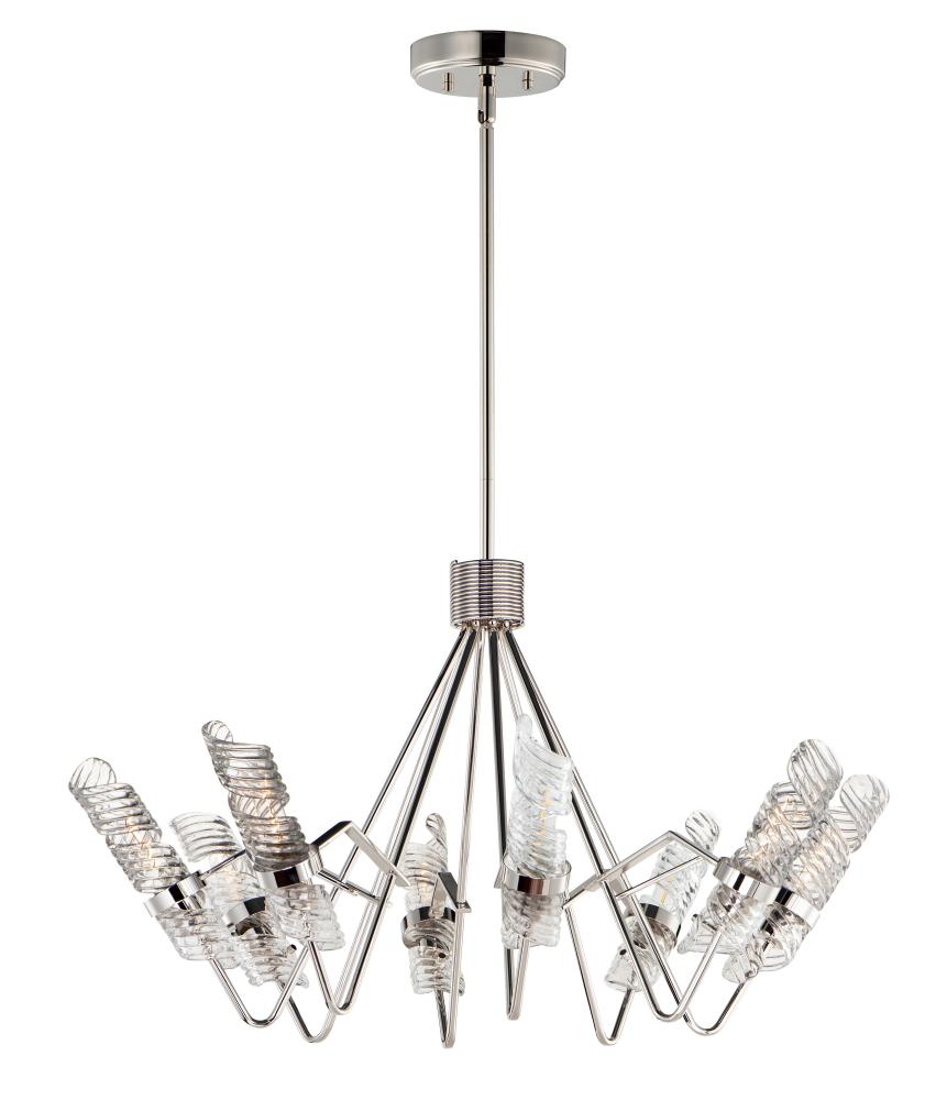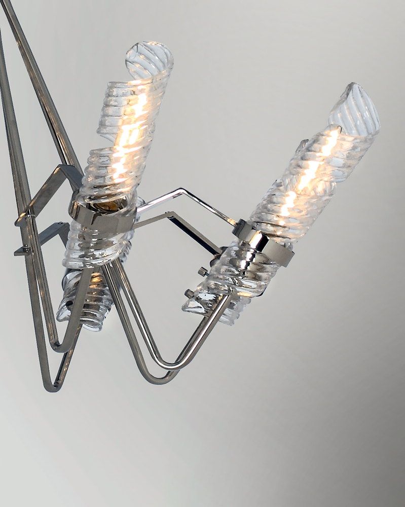 The highlight of this collection is the hand formed Clear spiral glass shades which are nested in a unique frame of Polished Nickel. Inspired by the craftsmen of Italy, these fixtures will become tomorrow's heirlooms.
