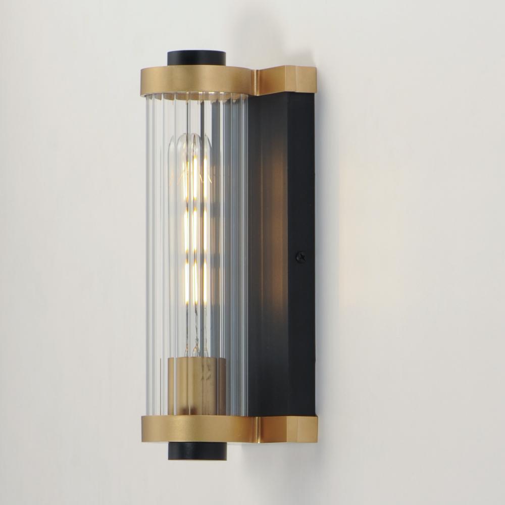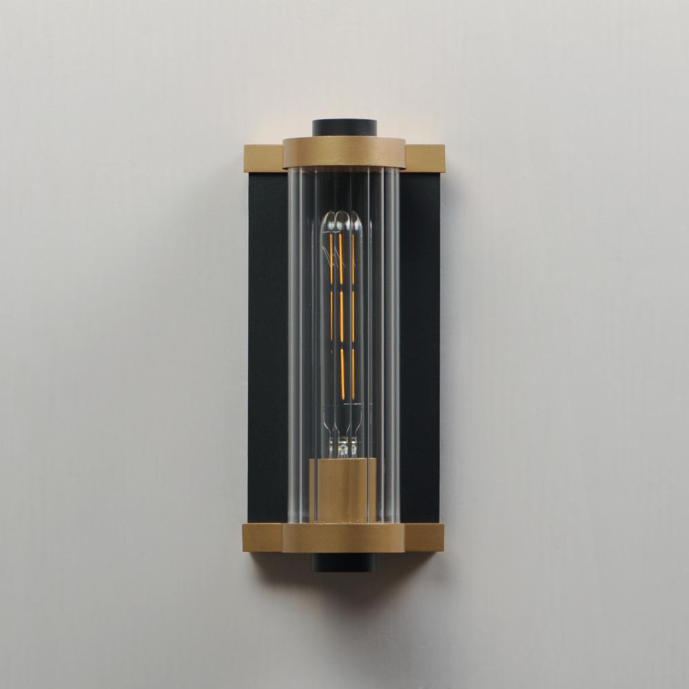 Internally ribbed clear glass tubes refract tubular lamps, creating a shimmering light effect. The glass is supported by a two-tone black frame with Aged Brass accents, making this sconce suitable for both indoor and outdoor installations. With a depth of