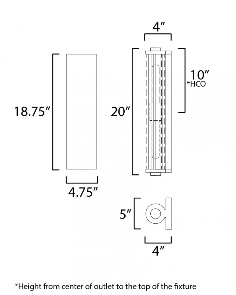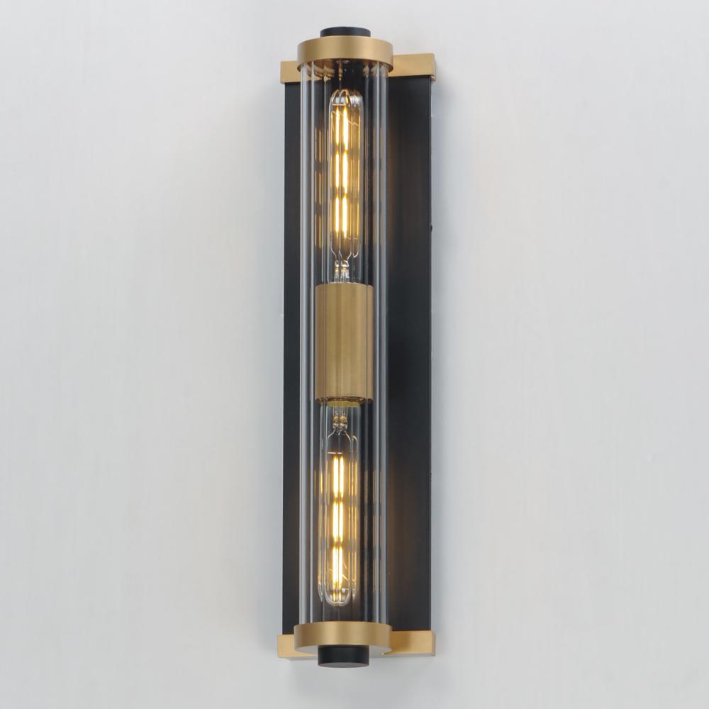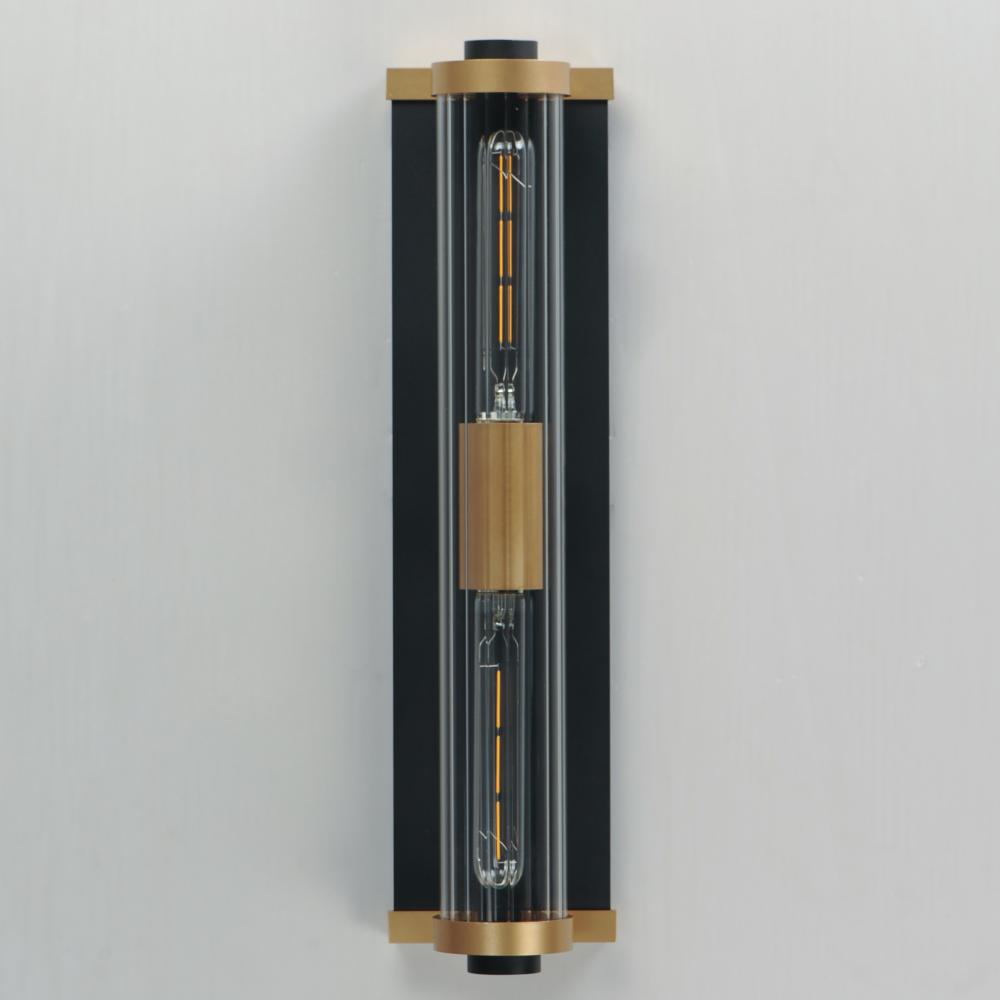 Internally ribbed clear glass tubes refract tubular lamps, creating a shimmering light effect. The glass is supported by a two-tone black frame with Aged Brass accents, making this sconce suitable for both indoor and outdoor installations. With a depth of