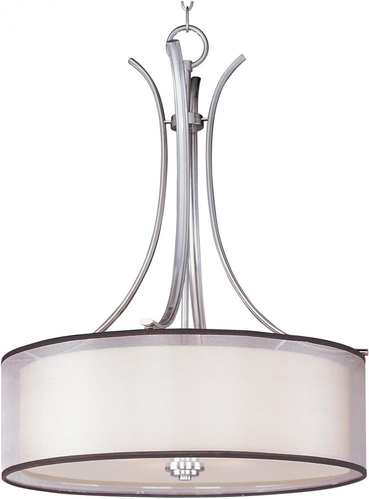 Orion collection's sweeping arms formed from oval-shaped Satin Nickel add stark contrast to the charcoal-colored, sheer fabric shades with Satin White interior glass. This contemporary collection works well in both modern and transitional interiors.