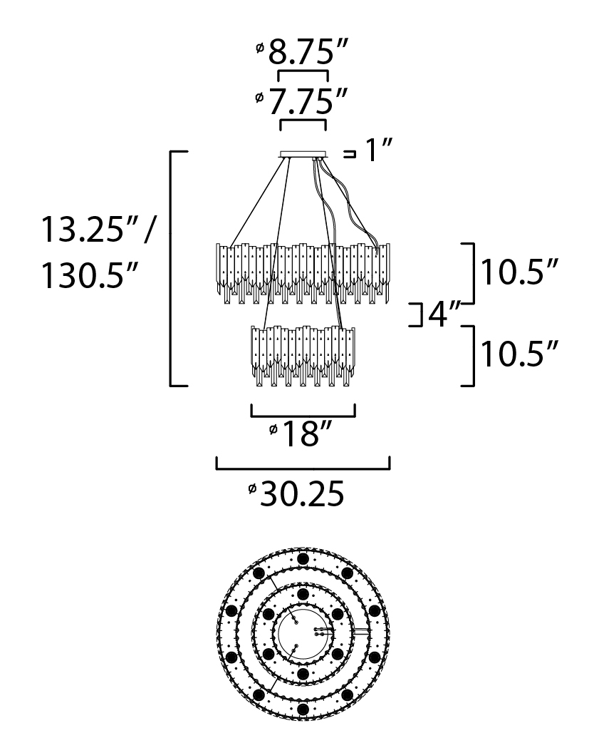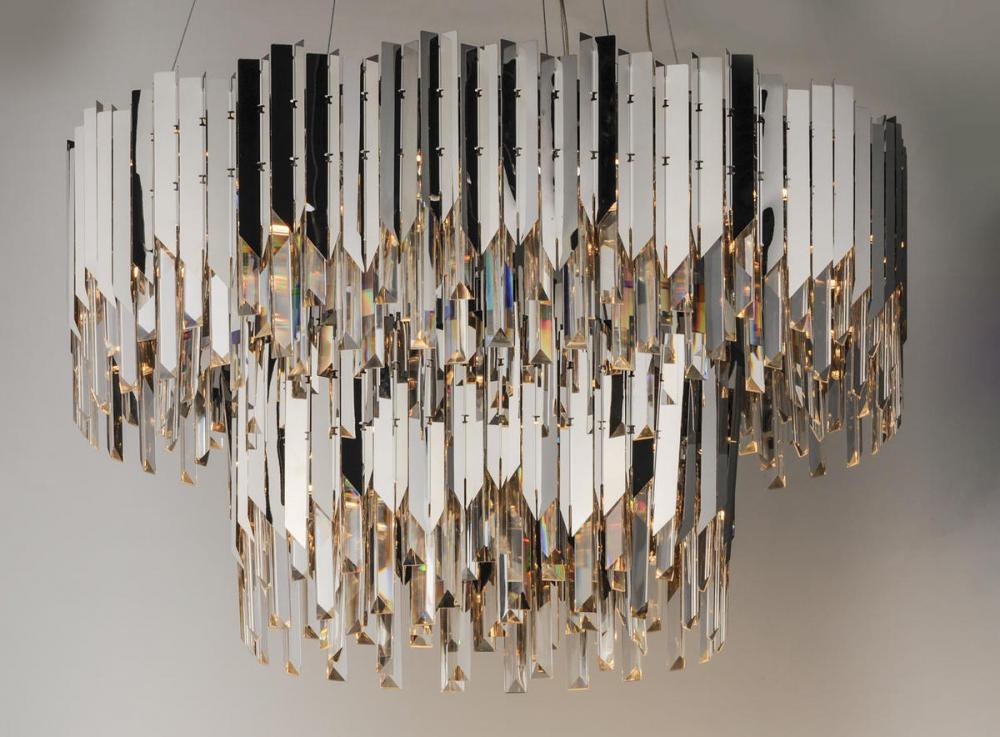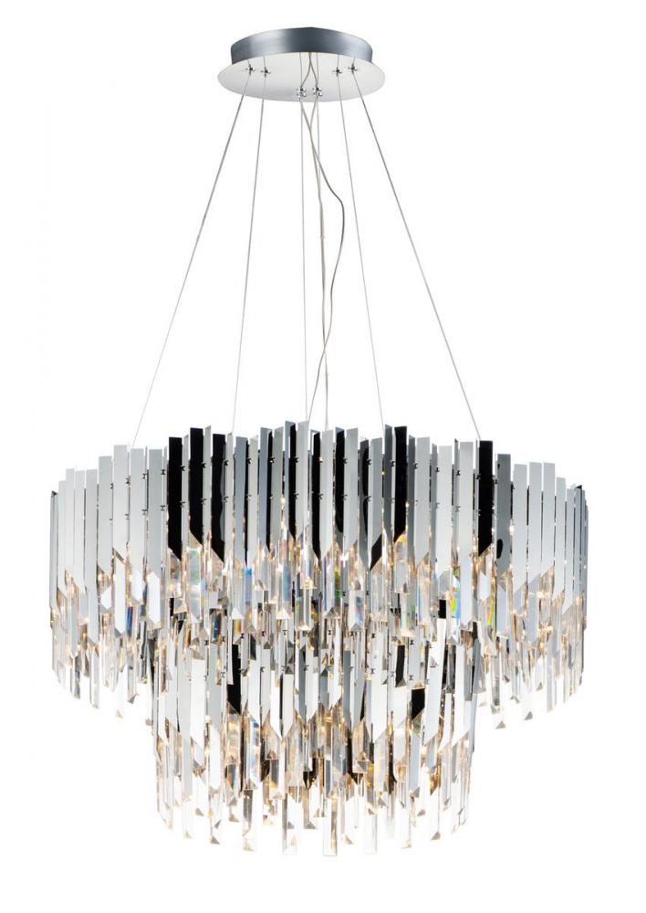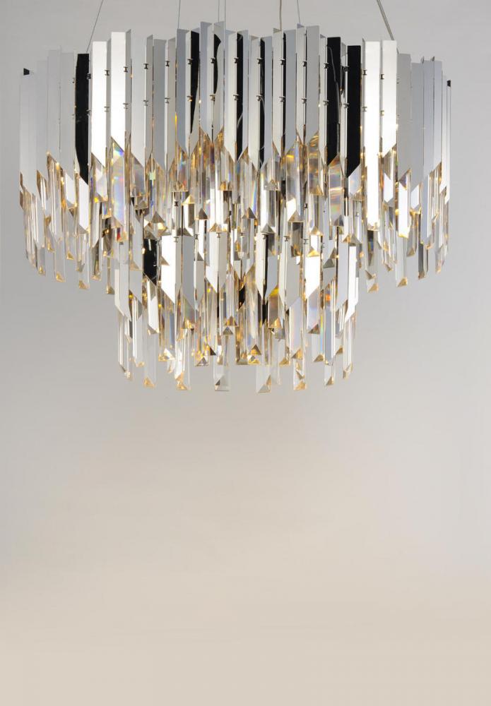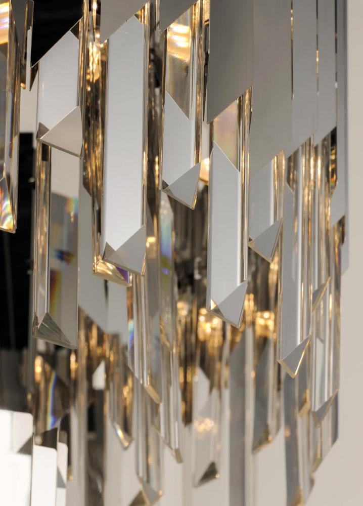 An exquisite collection featuring V-shaped stainless panels that trace a drum shade along cascading rows of Beveled Crystal prisms. The crystal shimmers under the light of replaceable LED reflector lamps. This updated crystal design will be at home in anywhere from traditional to contemporary settings.