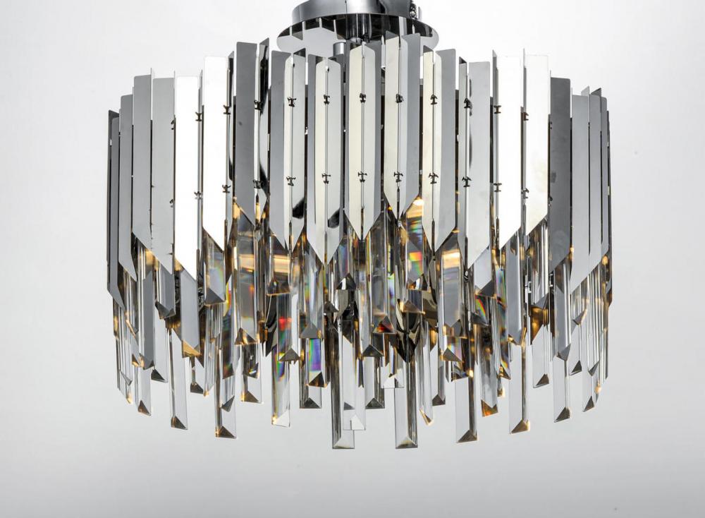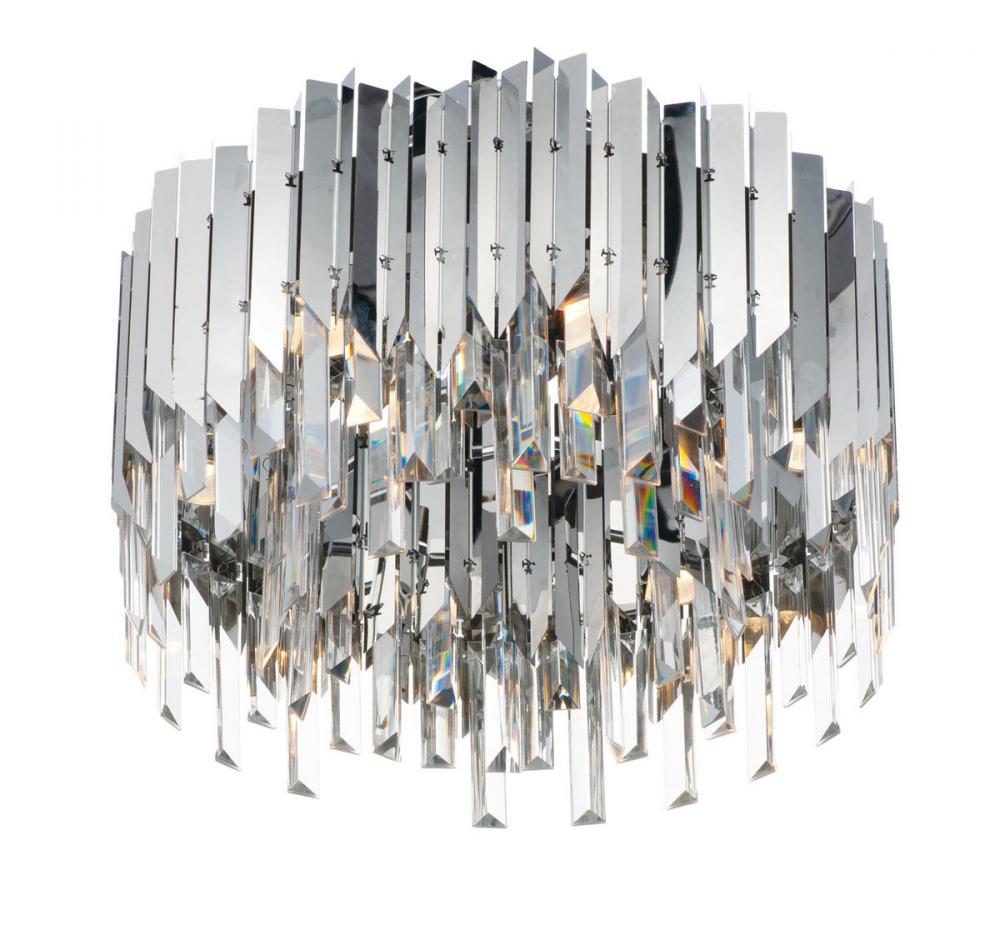 An exquisite collection featuring V-shaped stainless panels that trace a drum shade along cascading rows of Beveled Crystal prisms. The crystal shimmers under the light of replaceable LED reflector lamps. This updated crystal design will be at home in anywhere from traditional to contemporary settings.