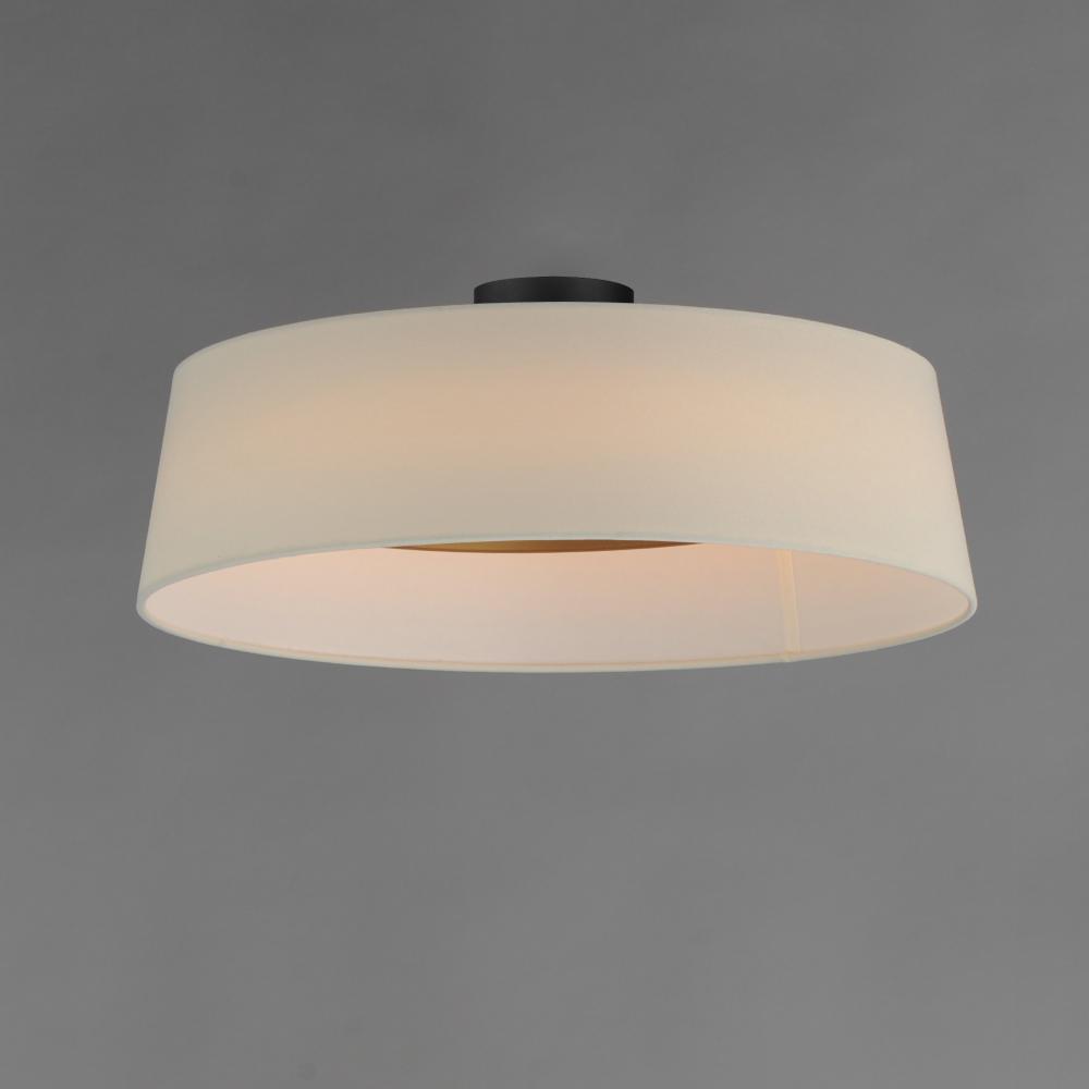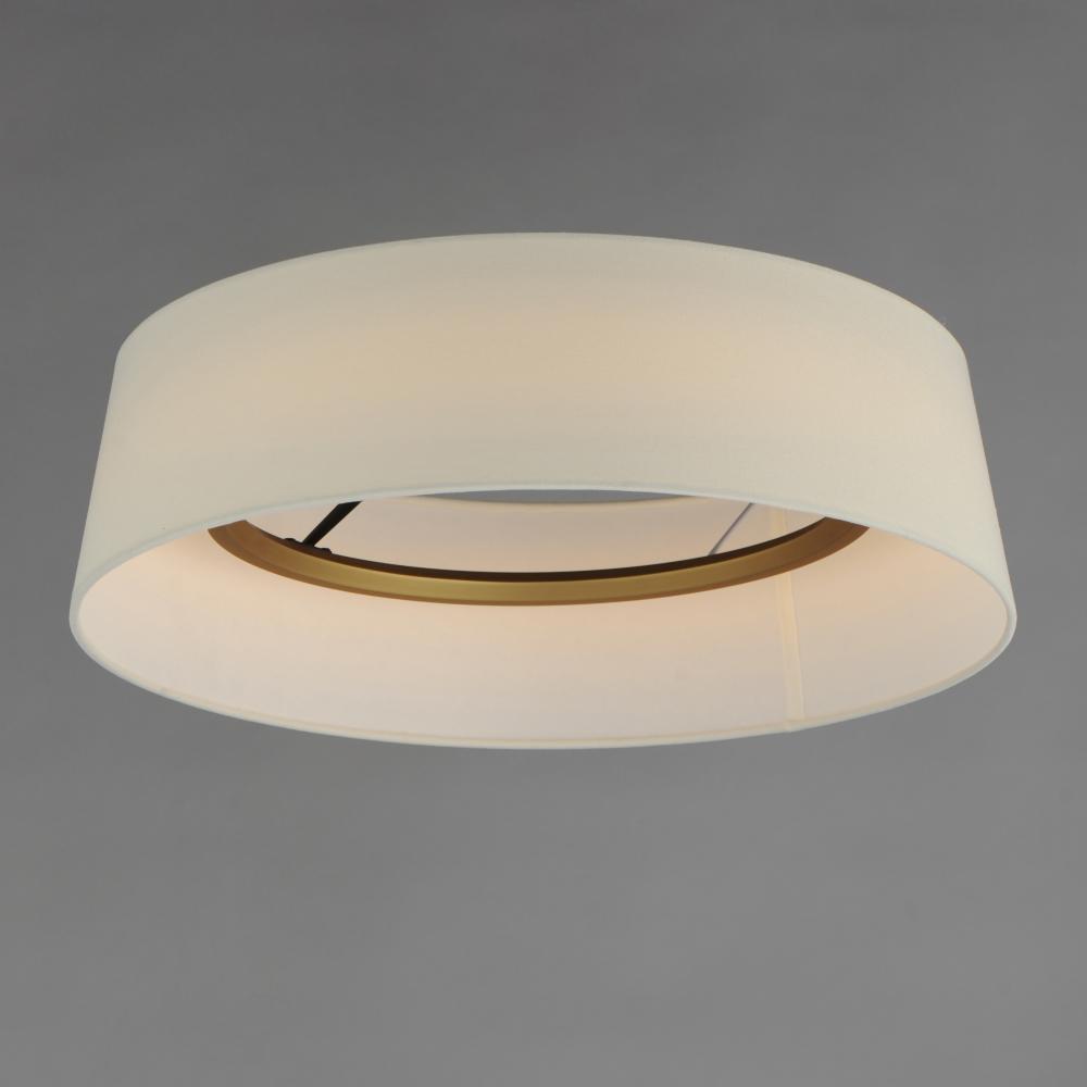Truncated tapered cones of linen shades diffuse light from an LED ring within them. The LED lighting offers ample illumination that is softly diffused behind the shade. A two-pronged fork detail supports the ring within further modernizing this transitiona