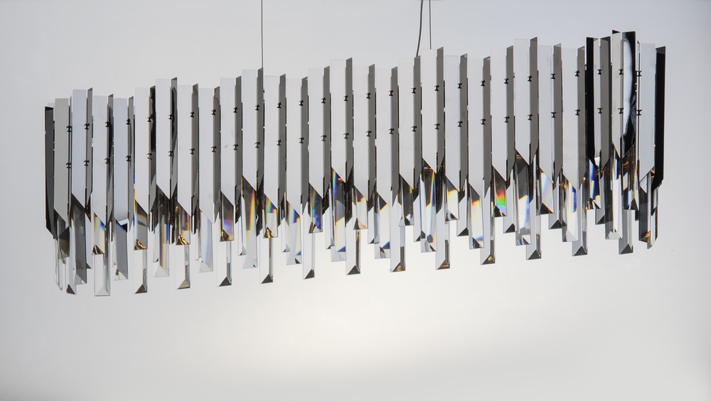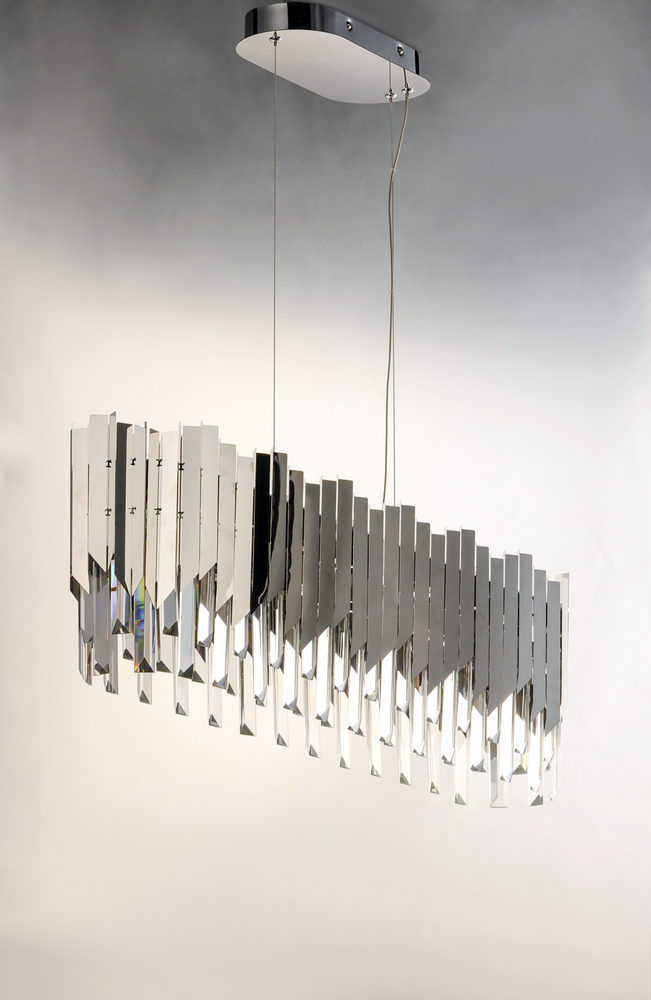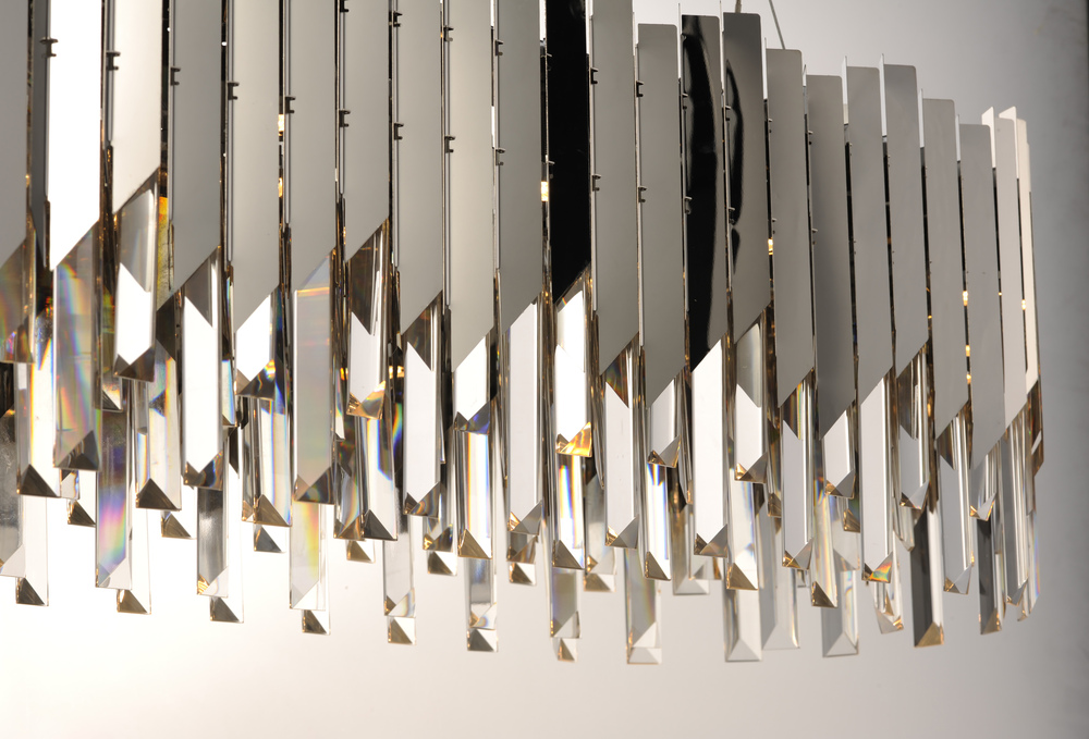 An exquisite collection featuring V-shaped stainless panels that trace a drum shade along cascading rows of Beveled Crystal prisms. The crystal shimmers under the light of replaceable LED reflector lamps. This updated crystal design will be at home in anyw