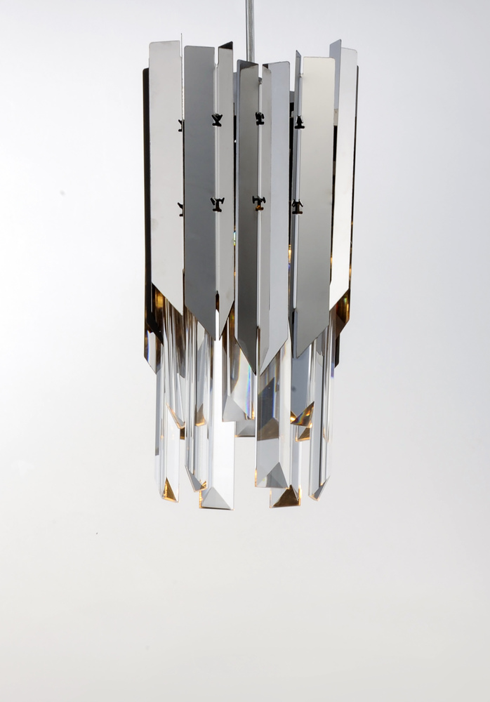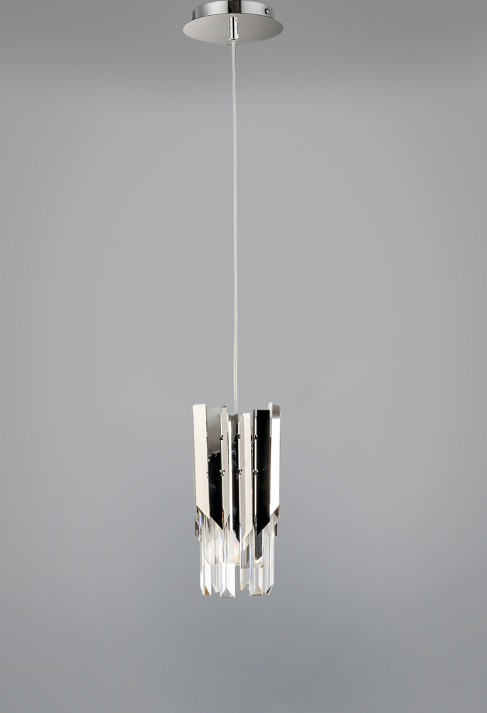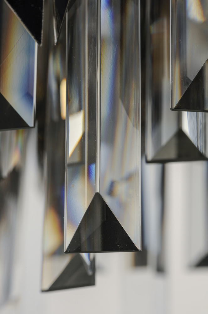 An exquisite collection featuring V-shaped stainless panels that trace a drum shade along cascading rows of Beveled Crystal prisms. The crystal shimmers under the light of replaceable LED reflector lamps. This updated crystal design will be at home in anyw