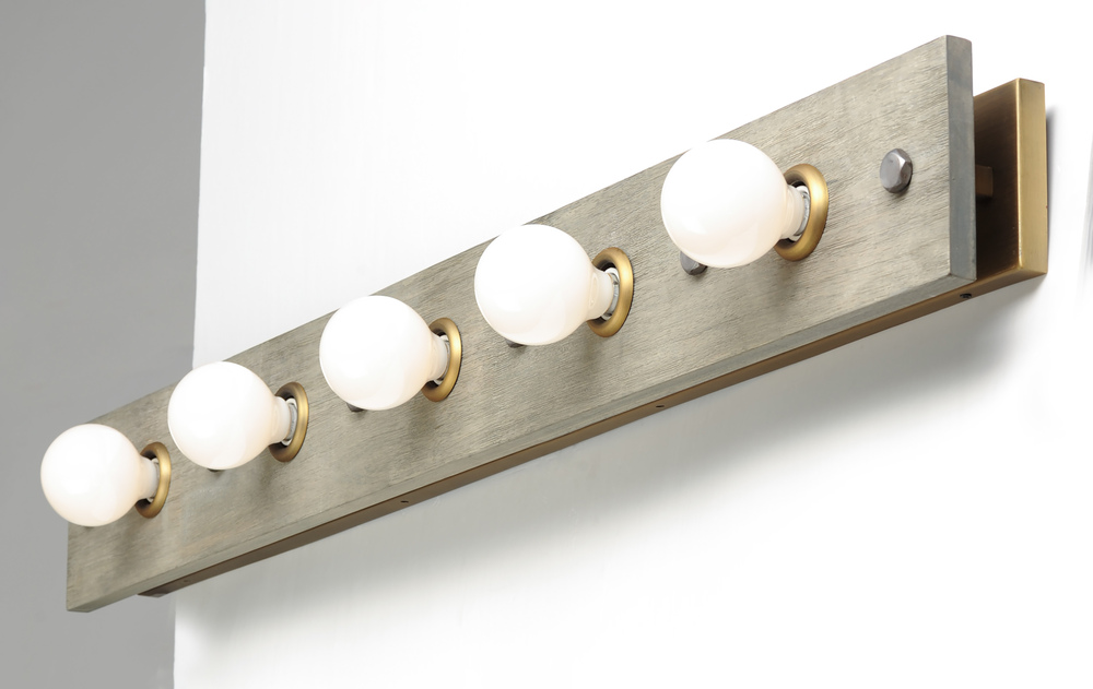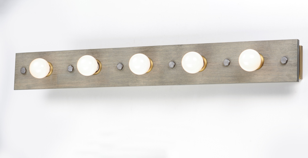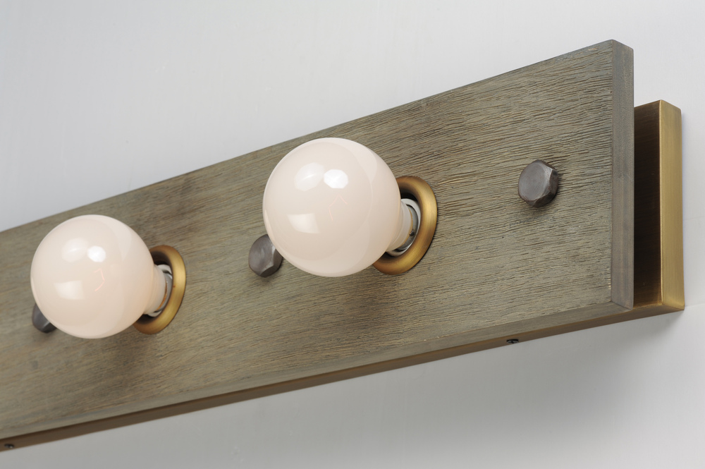 Planks of natural wood are distressed by hand and finished in Weathered Wood with Antique Brass accents, to create a rustic reclaimed look. Lacquered raw metal hex nuts provide an additional decorative element. The overall design can be changed by your cho