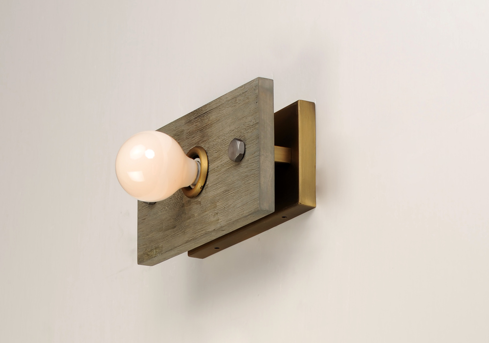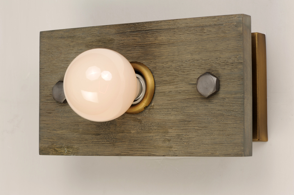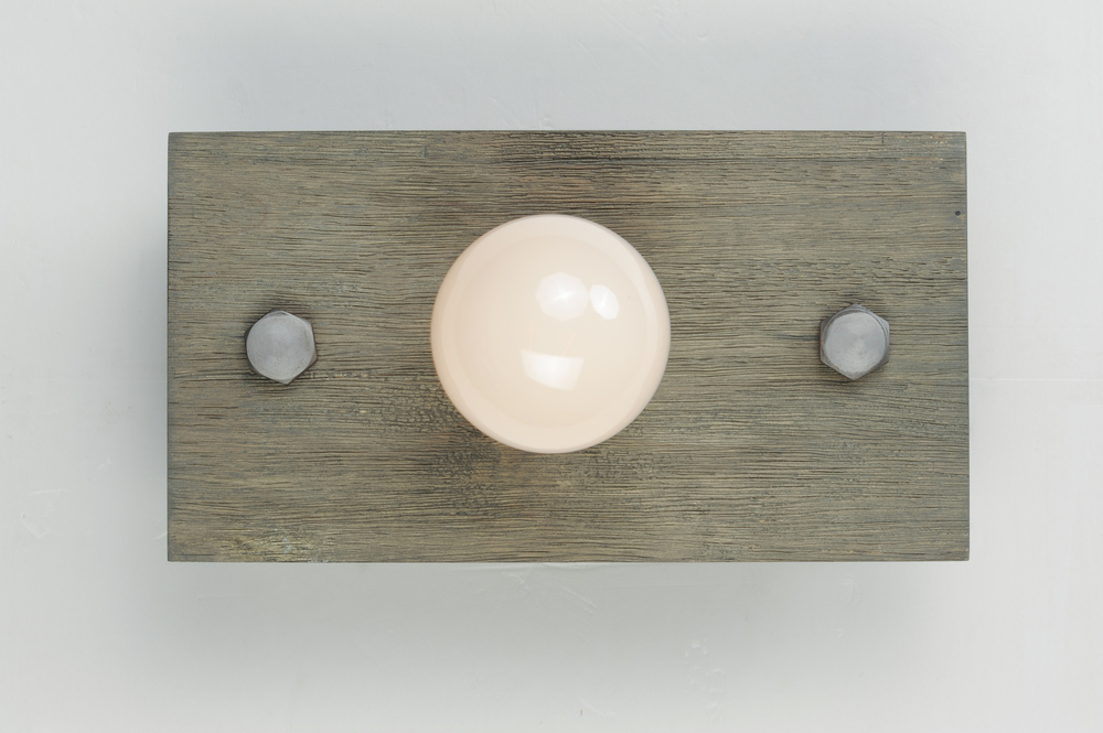 Planks of natural wood are distressed by hand and finished in Weathered Wood with Antique Brass accents, to create a rustic reclaimed look. Lacquered raw metal hex nuts provide an additional decorative element. The overall design can be changed by your cho