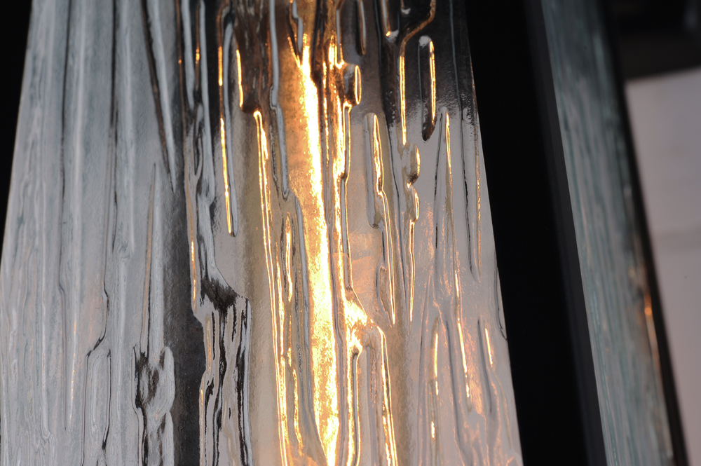 A tapered square shade finished in Olde Brass suspends from a bracket to replicate a nautical lantern. Panels of clear Ripple glass allow for the lamp to shine through while still diffusing the light. The medallion at the base of the shade and rivets along