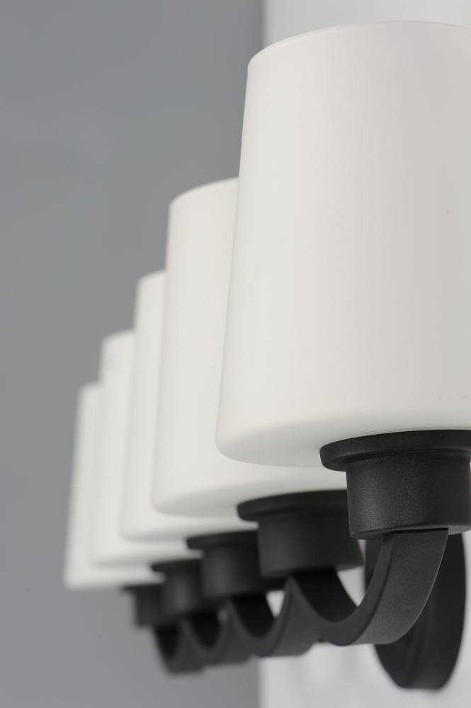 Graceful arcs of rectangular tubing transition to round cups that support tapered Satin White glass shades creating a crisp and clean transitional design. The frame is finished in your choice of Satin Nickel or Black which bridges modern and transitional d