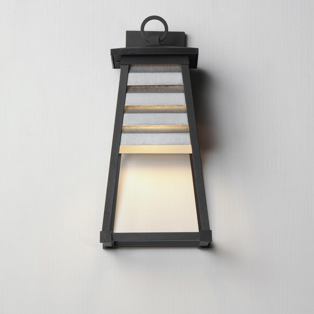 Contrasting louvered insets are set within Matte Black trapezoidal frames. The frames are made of Vivex so their finish will withstand harsher climates. The louvered panel insets are made of aluminum and feature a full cut-off design aesthetic making this