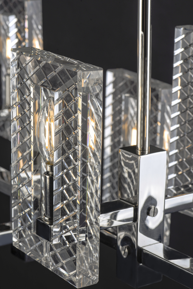 Solid blocks of Clear optic crystal are etched and carved and supported by contemporary frames finished in a lustrous Polished Chrome. The high polished frame compliments and enhances the beauty of these hand crafted crystal blocks.