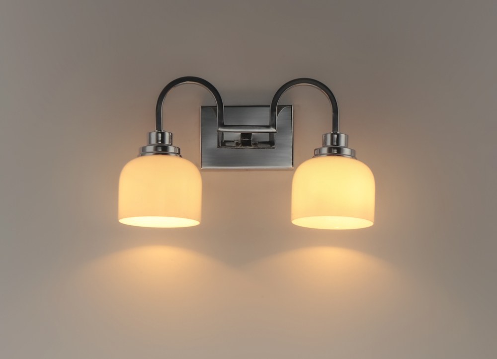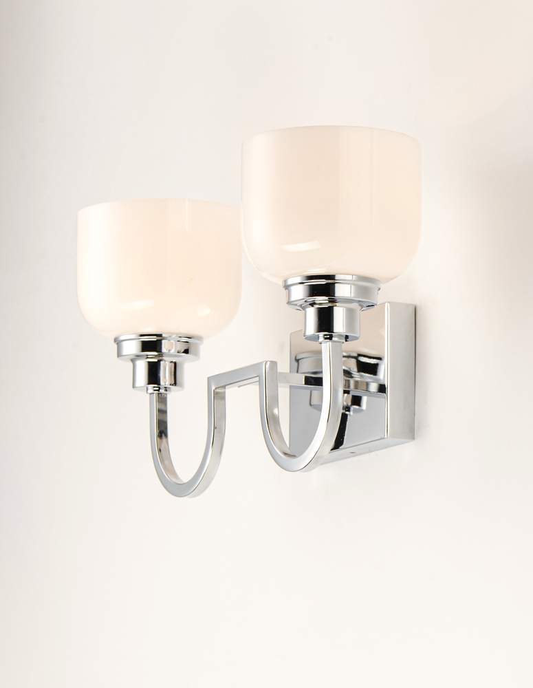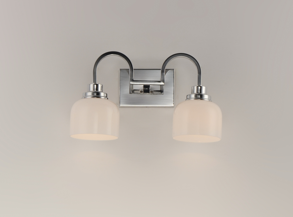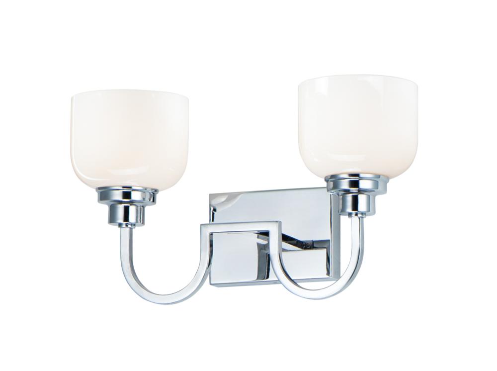 Square tube arms curve to form arcs of Polished Chrome in an interesting and unique fashion. White opal glass shades complete this clean design and provide a soft even illumination. Can be installed up or down.