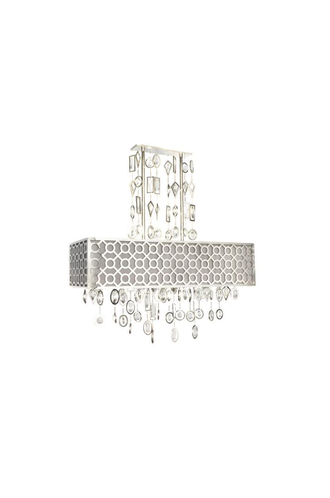 A geometric pattern in a frame of Stainless Steel finished in Polished Nickel is contrasted by an inner Slate fabric shade. Geometric shaped cast pendants frame custom-made crystals, adding brilliant accents throughout the fixture.