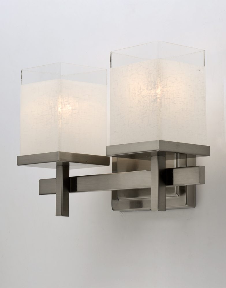 Square glass shades ride upon a rectangular bar to create geometry at its best. Available in Polished Chrome with Satin White glass and Satin Nickel and white Linen glass.