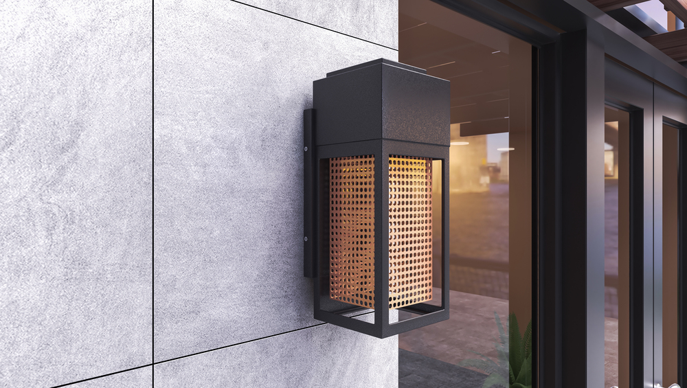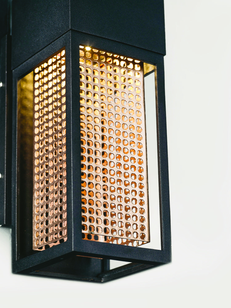 A open air frame of cast aluminum surrounds a stainless steel mesh diffuser which creates an unusual lighting effect as the LED light illuminates the inside. Finished in either Galaxy Black with a polished Stainless Steel mesh or Galaxy Bronze with Rose Go
