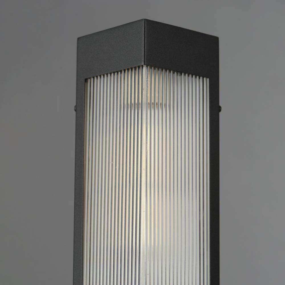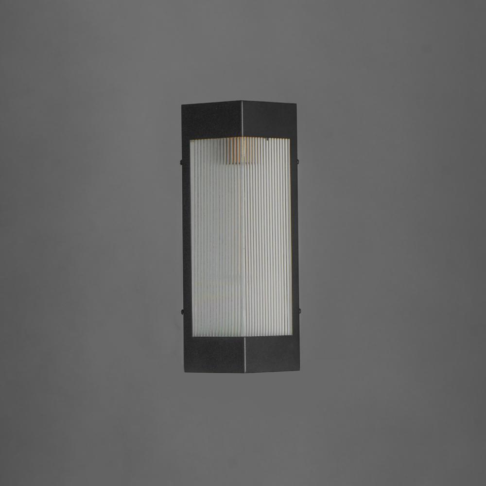 A transitional design suitable for both modern and more traditional applications, this outdoor series of lighting features Clear Ribbed glass that refracts the light source within triangular frames. A Black frame with warm Antique Brass light clusters with