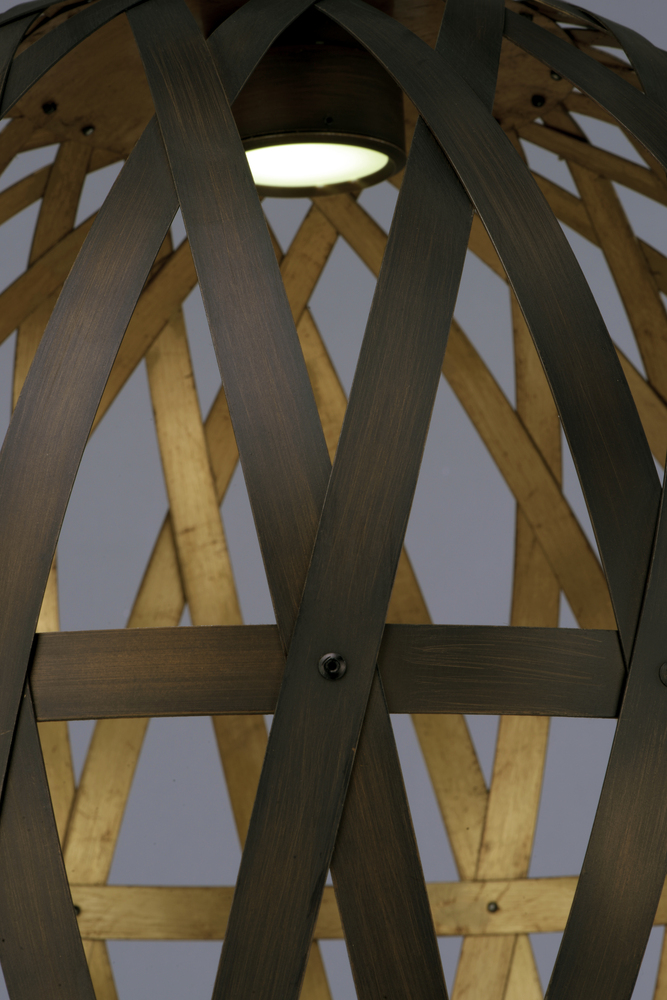 Bands of metal are woven on a frame and finished in Bronze Gilt on the outside and a contrasting Gold Leaf finish on the inside. An LED light source peers through openings in the weave and directs light outward eliminating any strobing effect that fans may