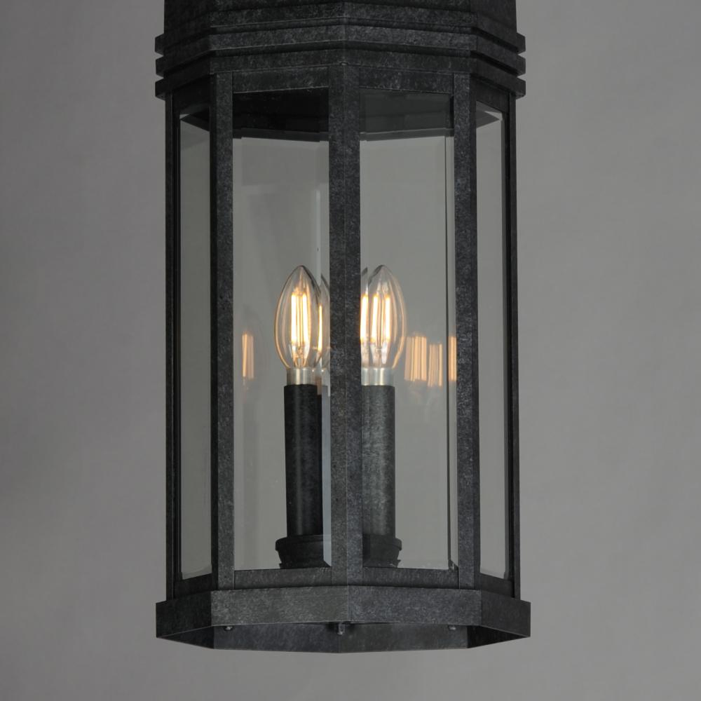 Inspired by the intricate geometric motifs of the iconic architect, the Wright collection of outdoor lighting features a hexagonal frame with tiered louvers along its hood. Beveled at its edges, the Clear glass panes encase the lighting cluster within a ro