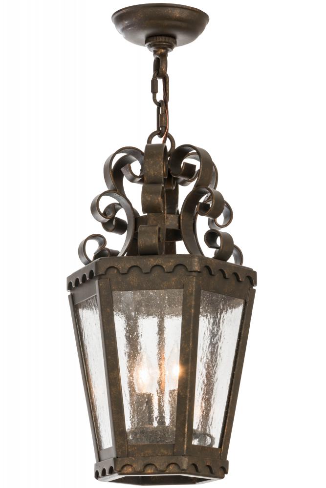 The sophisticated Cadenza lantern is designed with elaborate scroll details and brilliant elegance. Custom crafted of Hand-forged iron with a hand-applied Gilded Tobacco finish and complemented with 6 panels of Clear Seeded Glass. Designed with high-style appeal; the fixtures are used for beautiful ambient lighting in corridors; porches; entryways and other residential and commercial spaces. Custom designs; sizes and finishes are available; as well as dimmable energy efficient lamping options such as LED. The 10-inch wide pendant is UL and cUL listed for dry and damp locations.