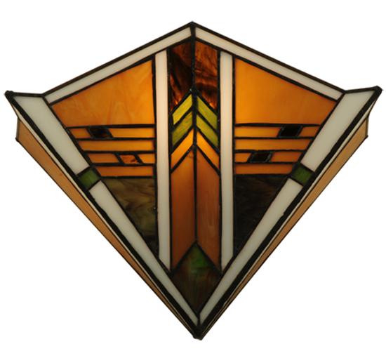 Offering a unique and handsome Mission design; Abilene depicts colorful arrowheads of Green and Amber on a multi-designed motif of linear locks of Green and Amber; highlighted with Yellow and Amber Jewels. The handcrafted stained glass shade; which features a Mission design that interprets organic objects into geometric forms; is framed in White glass and was created using Meyda Tiffany's famous copperfoil construction process.