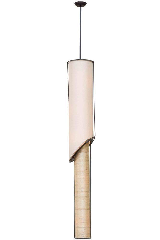 A unique; two-piece cylindrical profile; this intriguing ceiling fixture reveals an innovative design with the top shade featuring Beige Oil Rubbed Kraft Paper and the bottom shade in a Beige Arrow Root with a White acrylic bottom diffuser. This eye-catching pendant is enhanced with Timeless Bronze hardware. Handcrafted by highly skilled artisans in our 180;000 square foot manufacturing facility in Yorkville; New York; this pendant is available in a wide range of custom choices including various designs; colors; sizes and dimmable energy efficient lamping options such as LED. This fixture is UL and cUL listed for damp and dry locations.